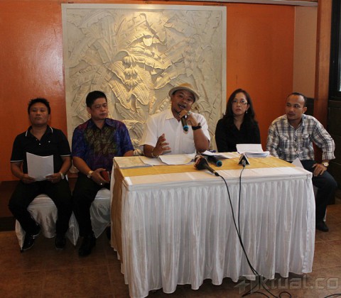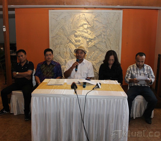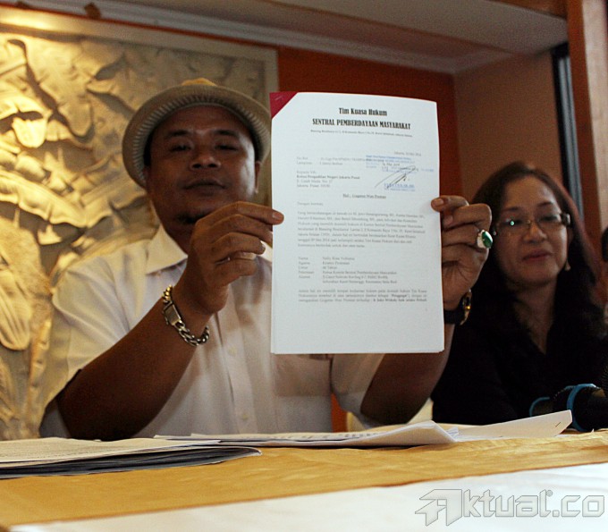 Kuasa hukum Sentral Pemberdayaan Masyarakat (SPM), Renol Sihombing, didampingi timnya Kamto Hamdan SH, M Jetro SH, Hendri Sianturi SH dan Ketua Komite Sentral Pemberdayaan Masyarakat Nelly Rosa, memperlihatkan surat gugatan kepada Gubernur DKI Joko Widodo, oleh SPM saat konferensi pers di Jakarta, Jumat (16/5/2014). Dianggap telah melanggar perjanjian yang sudah disepakati saat masa Kampanye pemilihan Gubernur DKI Jakarta 2 tahun lalu, Gubernur DKI Jakarta Joko Widodo digugat sebesar 104 miliar oleh organisasi Sentral Pemberdayaan Masyarakat (SPM). Gugatan yang telah didaftarkn ke pengadilan Negeri Jakarta Pusat tersebut karena Jokowi dianggap telah melupakan jasa dan kerja keras SPM yang dinilai memiliki andil dalam pemenangannya sebagai Gubernur DKI Jakarta dan melanggar perjanjian kontrak politik yang telah disepakati bersama. Aktual/Tino Oktaviano