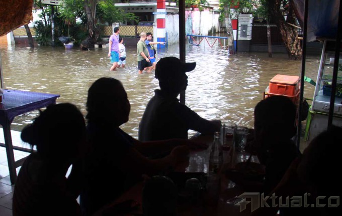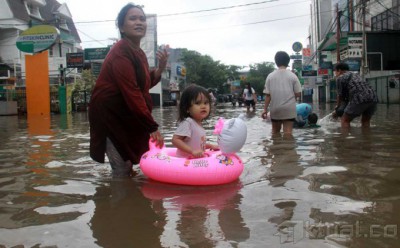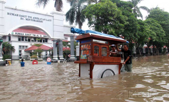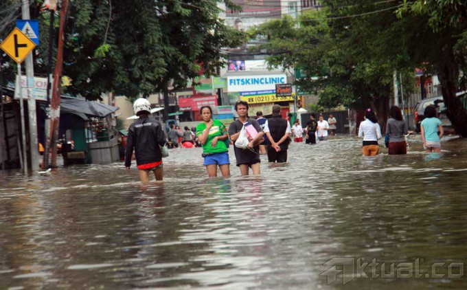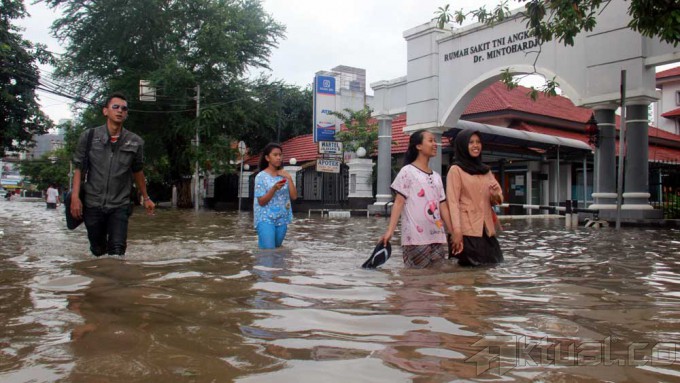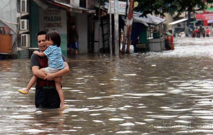 Sejumlah warga melewati banjir yang menggenangi kawasan Bendungan Hilir, Jakarta, Rabu (29/1/2014). Hujan deras yang semalaman mengguyur Jakarta membuat Jalan Bendungan Hilir (Benhil) Raya tergenang banjir setinggi 60cm. Aktual/Tino Oktaviano