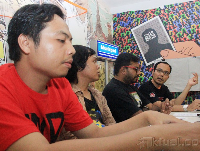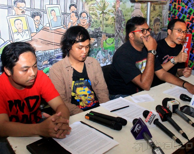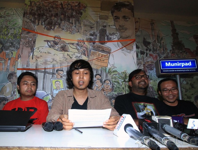 Dari kiri ke kanan, Wakasekjen KNTI Niko, Staf Kontras Ekobud Ananto Setiawan, Koordinator Kontras Haris Azhar, Ketua Umum KNTI Riza Damanik, saat konpres terkait kematian saksi kunci kasus perbudakan anak buah kapal asing Bejina di kantor Kontras, Jalan Mendut, Jakarta Pusat, Minggu (26/4/2015). Kontras dan Kesatuan Nelayan Tradisional Indonesia (KNTI) menyikapi kematian Yoseph yang secara tiba-tiba dan menimbulkan dugaan bahwa peristiwa itu berkaitan dengan upaya pengungkapan kasus perbudakan anak buah kapal asing oleh PT. Pusaka Bejina Resource (PBR) di Bejina, Kepulauan Aru, Maluku. AKTUAL/MUNZIR