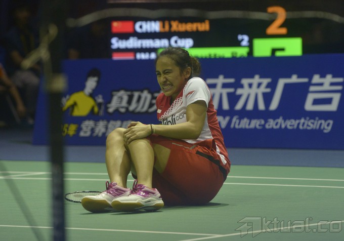Tunggal putri Indonesia Bellatrix Manupputy meringis kesakitan ketika mengalami cedera kaki pada semi final Piala Sudirman 2015 di Dongguan Basketball Center, Tiongkok, Sabtu (16/5). Tim Indonesia kalah 1-3 dari tim tuan rumah dan gagal ke final. ANTARA FOTO/Saptono