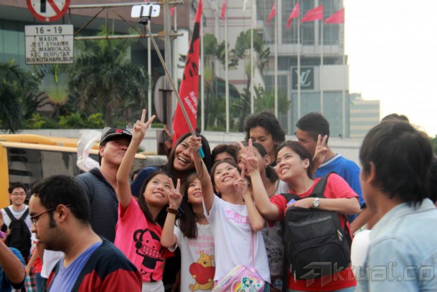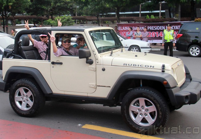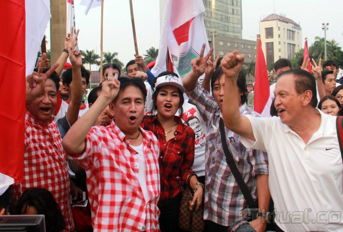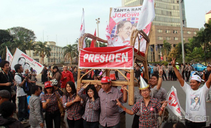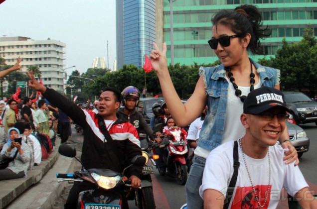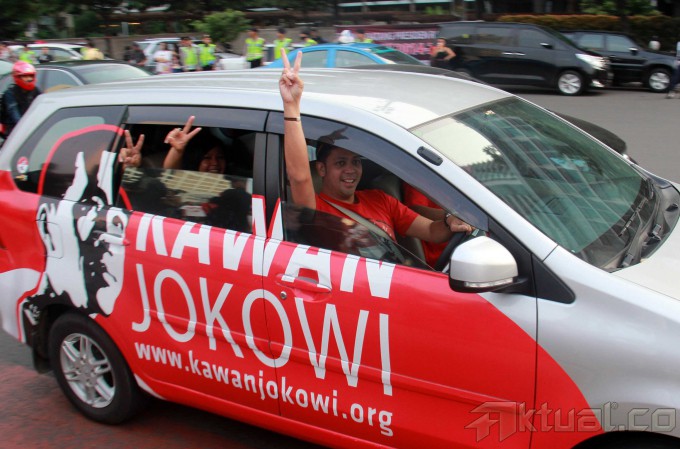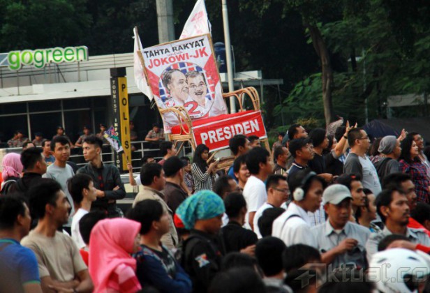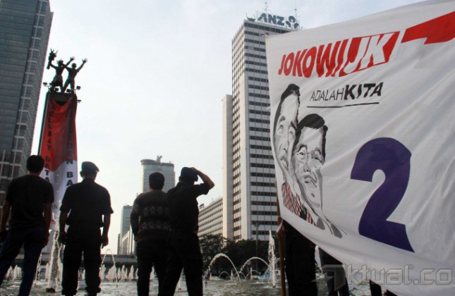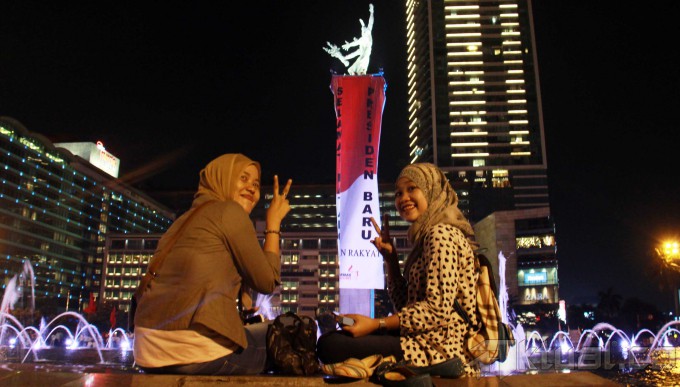 Suasana Bundaran Hotel Indonesia (HI) mendadak lebih heboh oleh para pendukung Jokowi – JK di Bundaran Hotel Indonesia, Jakarta, Rabu (9/7/2014). Mereka merayakan kemenangan Joko Widodo. Calon presiden yang diusung koalisi pimpinan PDI Perjuangan itu menang sementara dengan hasil quick count oleh beberapa organisasi survei. Aktual/Tino Oktaviano