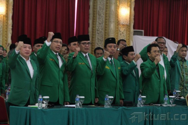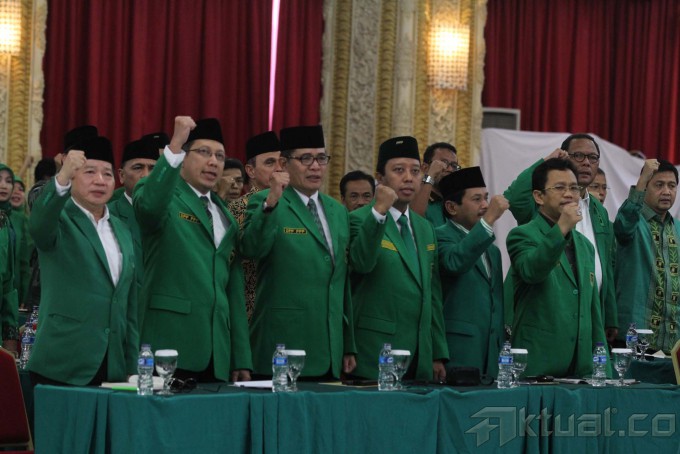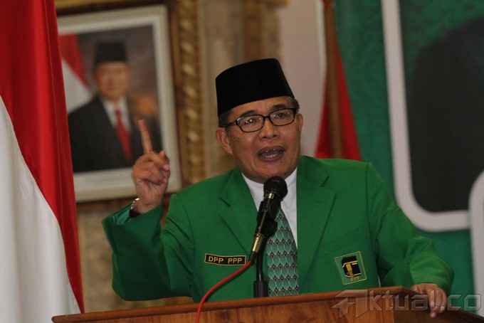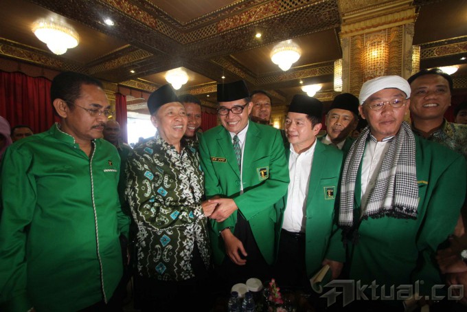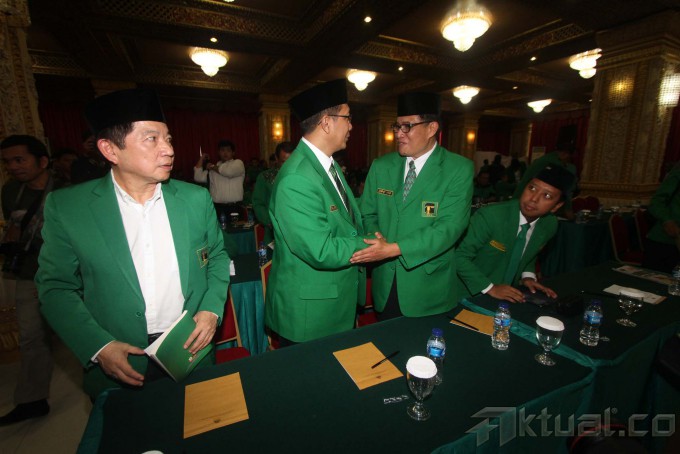 Wakil Ketua Umum Partai Persatuan Pembangunan (PPP) Emron Pangkapi (tengah) berbincang dengan Mantan Wapres Hamzah Haz (kedua kiri) dan Wakil Ketua PPP Suharso Manoarfa (kedua kanan) usai pembukaan Musyawarah Kerja Nasional (Mukernas) III PPP di Cisarua, Bogor, Jabar, Rabu (23/4/2014). Mukernas ke-III yang dihadiri oleh mayoritas DPW PPP dari seluruh Indonesia tersebut membahas kisruh PPP pasca Pemilu Legislatif 2014. Aktual/Tino Oktaviano