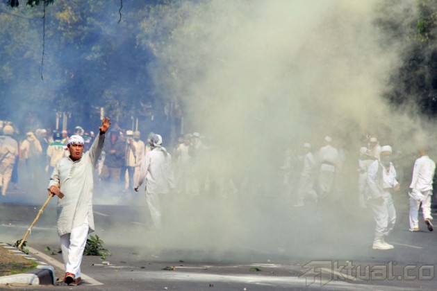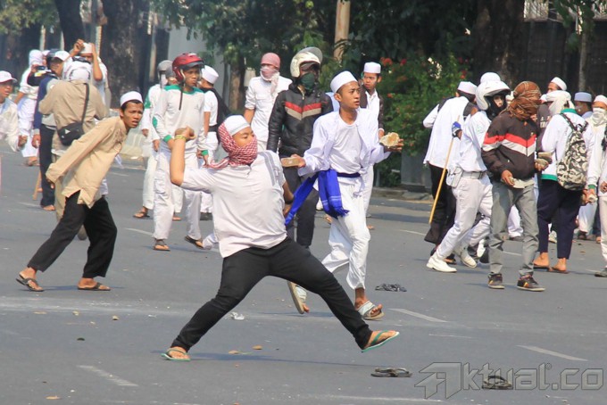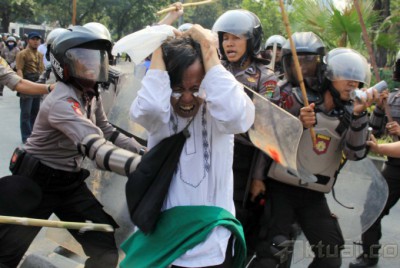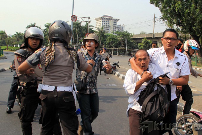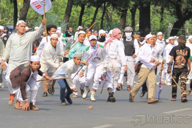Polisi mengankan anggota Fornt Pembela Islam (FPI) usai ricuh saat berunjuk rasa menolak Wagub DKI Basuki T Purnama atau Ahok di DPRD DKI, Jalan Kebon Sirih, Jakarta, Jumat (3/10/2014). Sejumlah anggota FPI diamankan. AKTUAL/STR