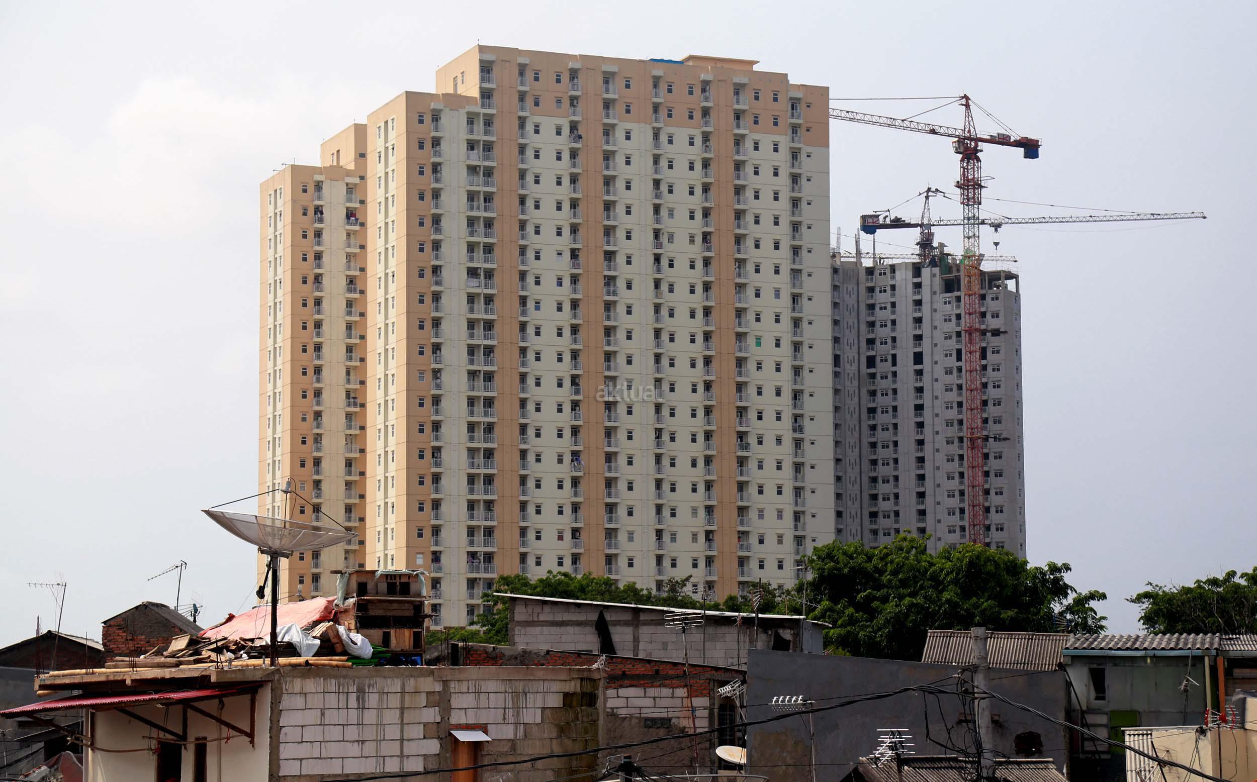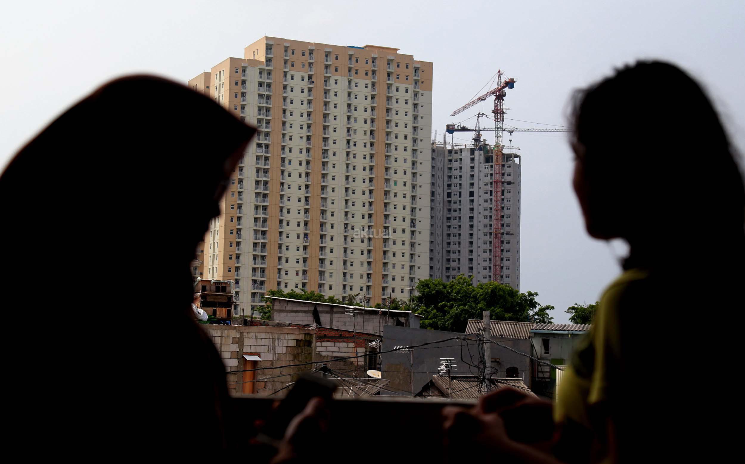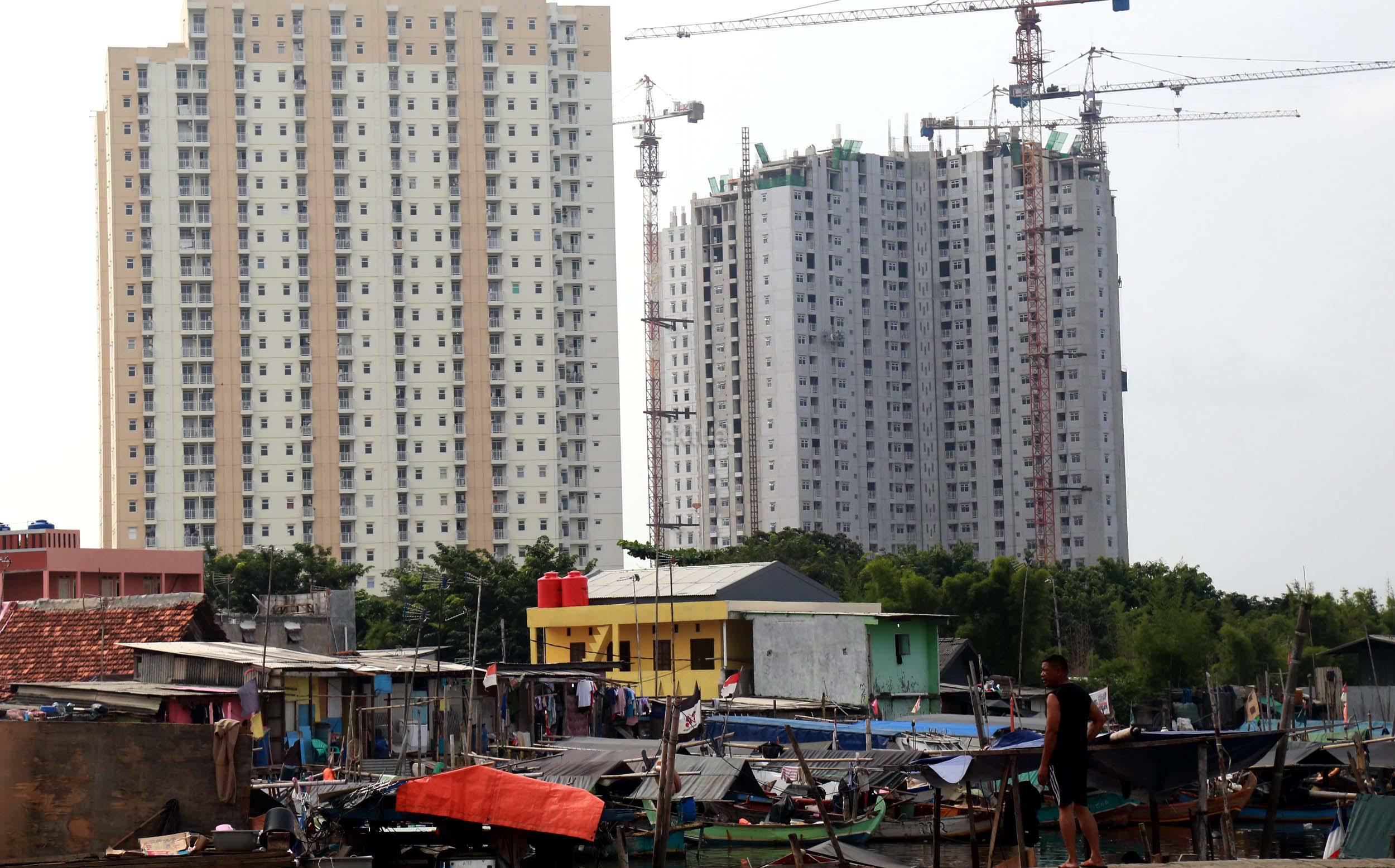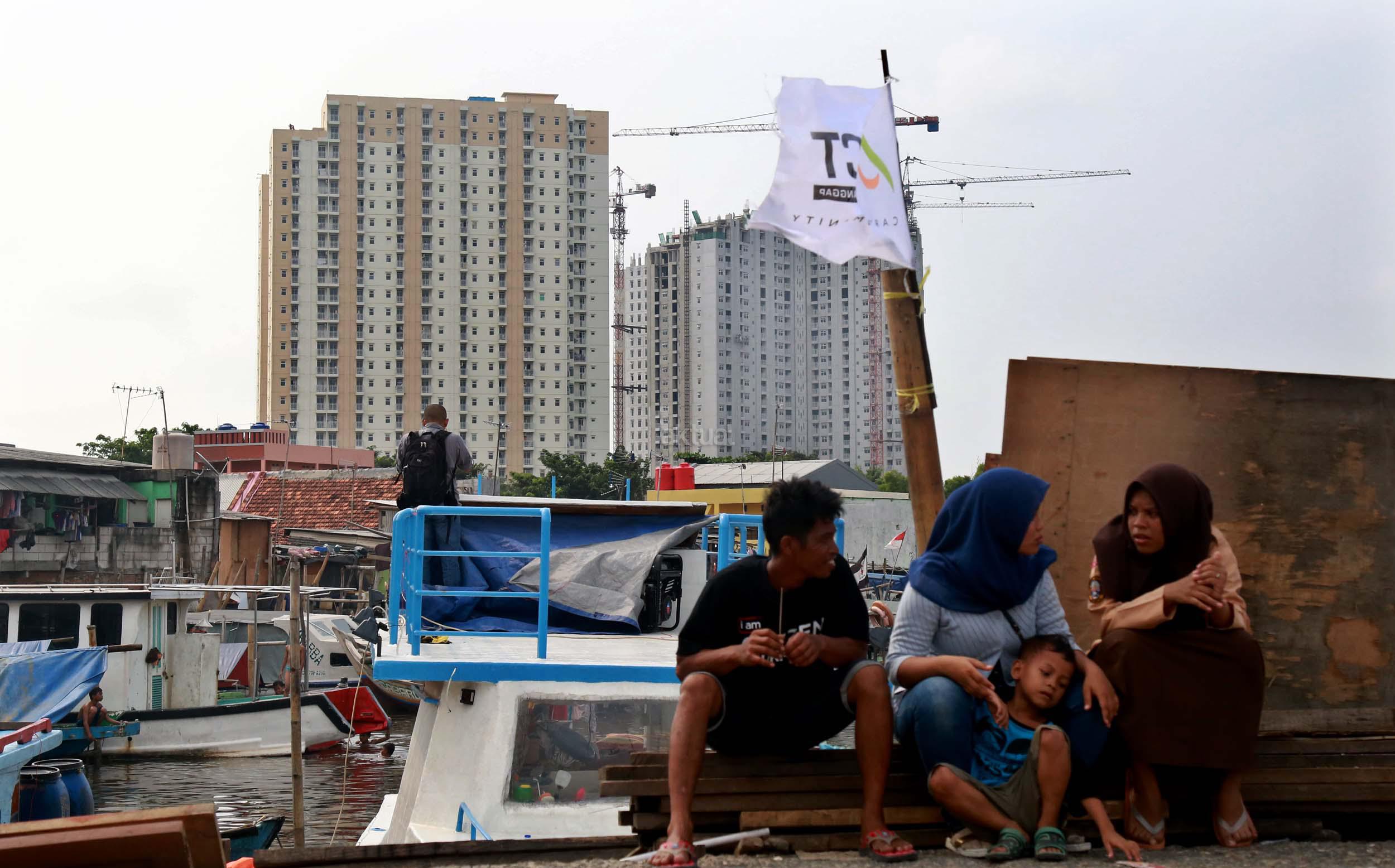Warga Kramat Luar Batang saat melihat proyek pembangunan apartemen Pluit Seaview (Tower Belize) dan Pluit Seaview (Tower Ibiza) di kawasan Penjaringan, Jakarta Utara, Sabtu (23/4/2016). Pasar properti pada 2016 diperkirakan kembali menggeliat seperti adanya beberapa proyek infrastruktur yang masif di beberapa titik Jakarta diyakini mampu meningkatkan harga jual proyek apartemen yang masih dalam tahap pembangunan.