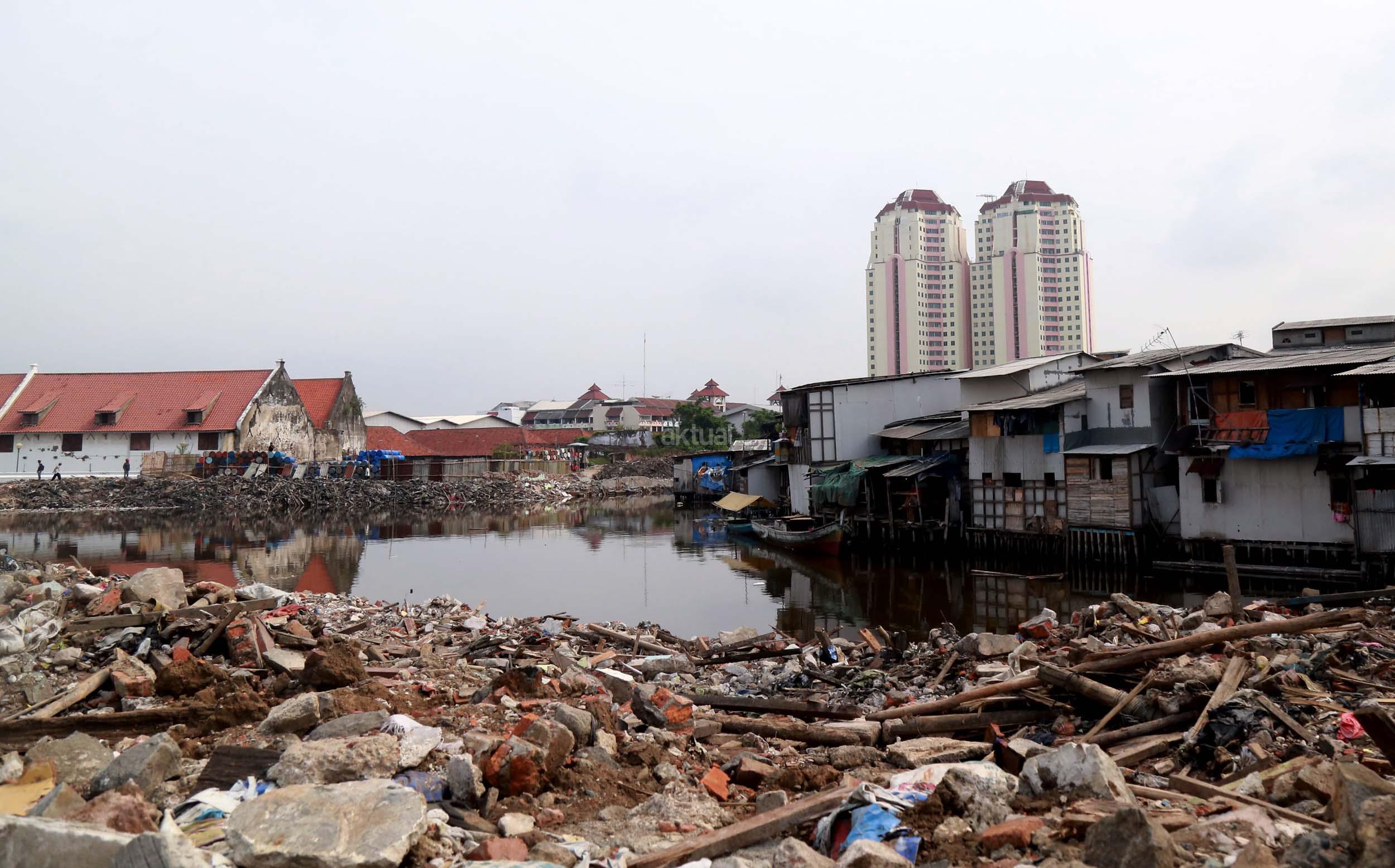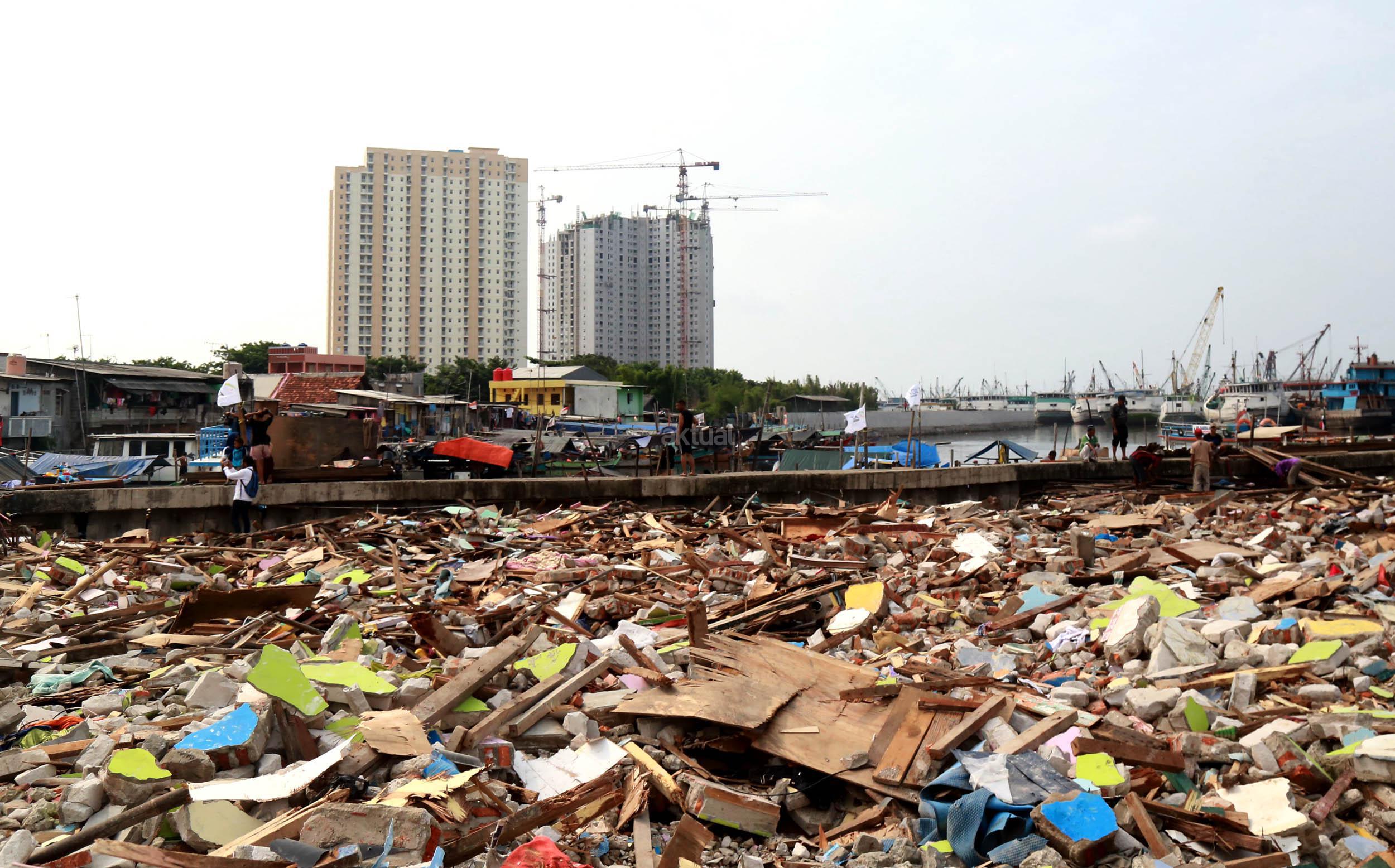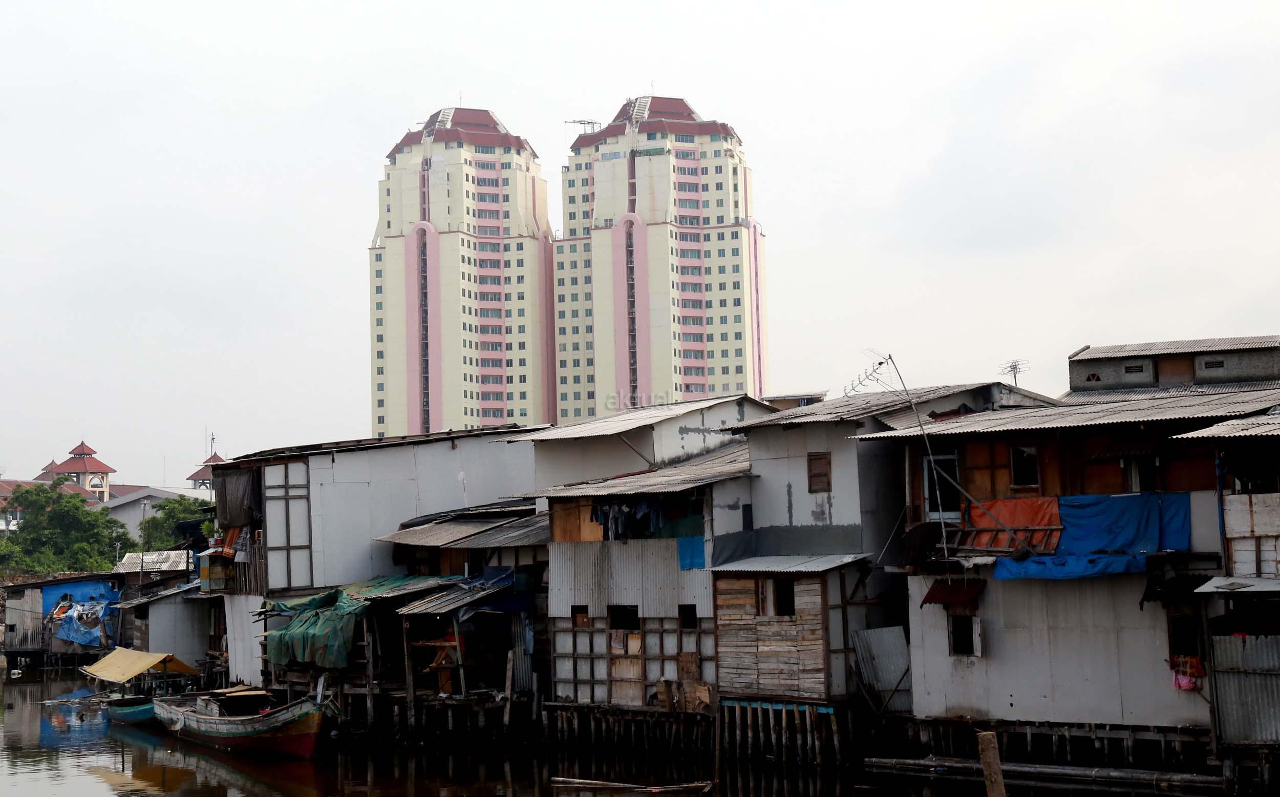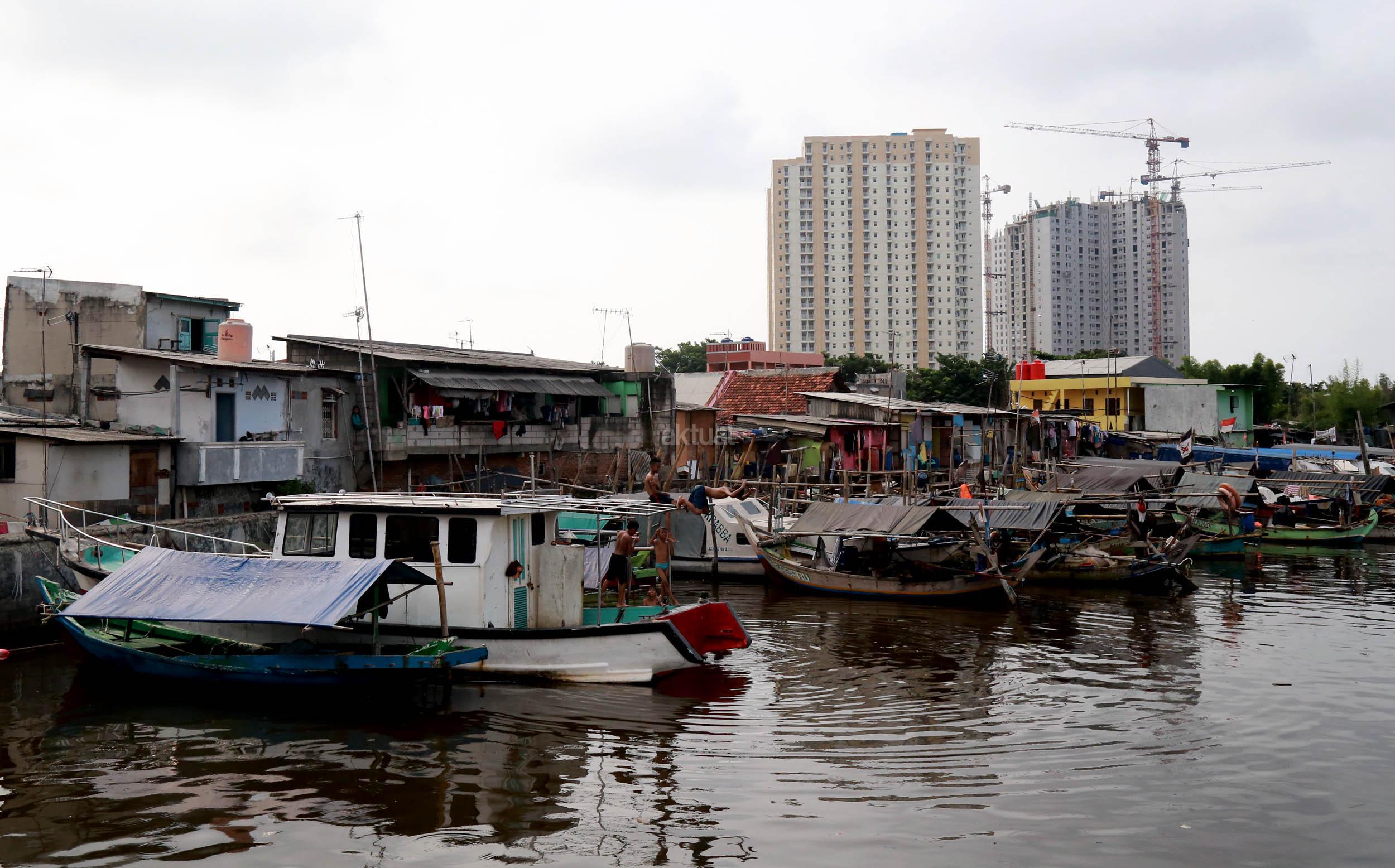Warga Kramat Luar Batang saat melihat proyek pembangunan apartemen Pluit Seaview (Tower Belize) dan Pluit Seaview (Tower Ibiza) di kawasan Penjaringan, Jakarta Utara, Sabtu (23/4/2016). Pasar properti pada 2016 diperkirakan kembali menggeliat seperti adanya beberapa proyek infrastruktur yang masif di beberapa titik Jakarta diyakini mampu meningkatkan harga jual proyek apartemen yang masih dalam tahap pembangunan.