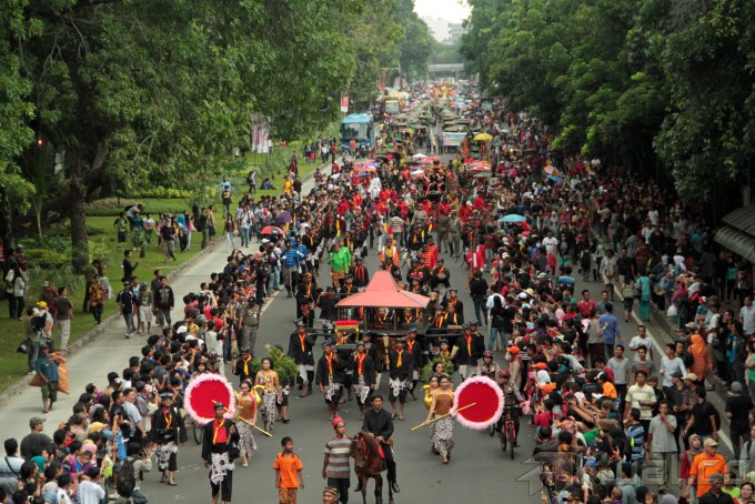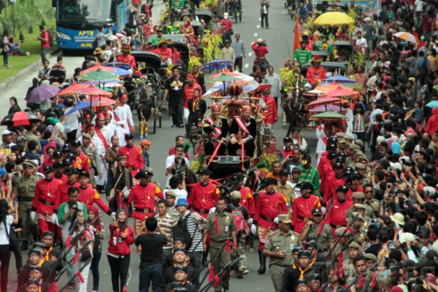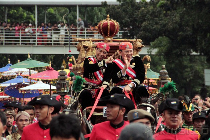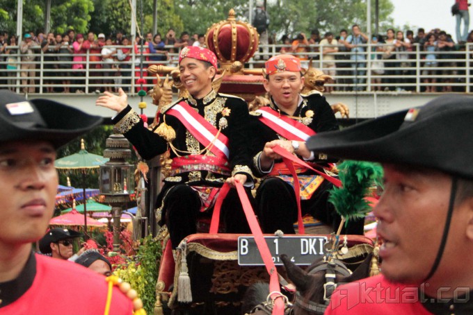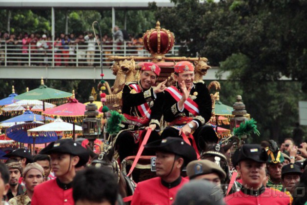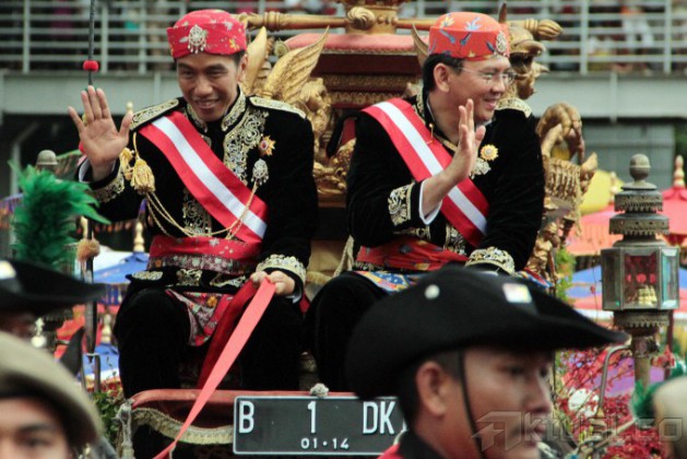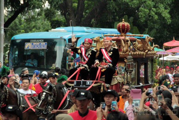 Gubernur DKI Jakarta Joko WIdodo (kiri) bersama wakilnya Jakarta Basuki Tjahaja Purnama (kedua kiri) berada di atas kereta kencana saat mengikuti arak-arakan kirab budaya di Jakarta, Minggu (8/12/2013). Kirab budaya tersebut melibatkan 1000 seniman, 156 raja di tanah air, 10 kerajaan mancanegara dan 80 kereta kencana. Aktual/Tino Oktaviano
