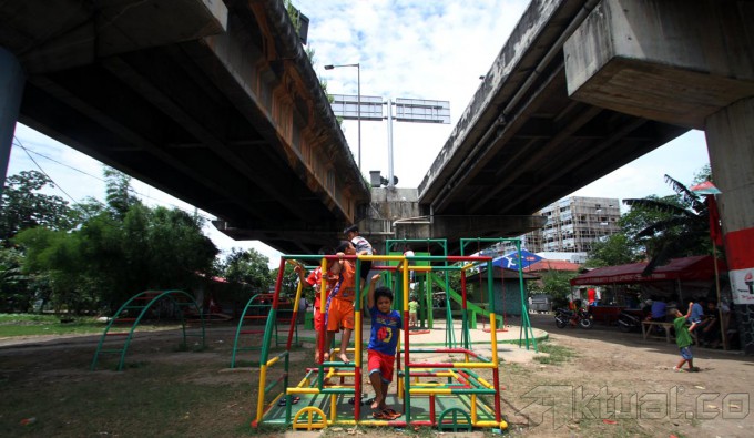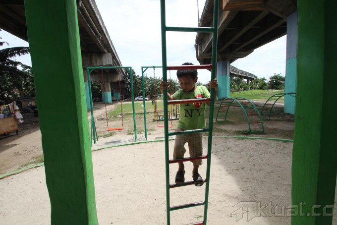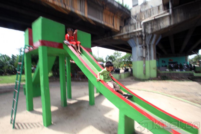 Sejumlah anak bermain dibawah jalan layang didaerah Plumpang Jakarta Utara, Minggu 5 Desember 2014. Semakin sempitnya lahan bermain dan lahan terbuka hijau membuat anak-anak di Jakarta bermain ditempat yang bukan semestinya. Pemprov DKI harus lebih banyak menyediakan fasilitas lahan terbuka hijau dan sarana menunjang untuk arena bermain anak-anak. aktual/Bagas Triputro