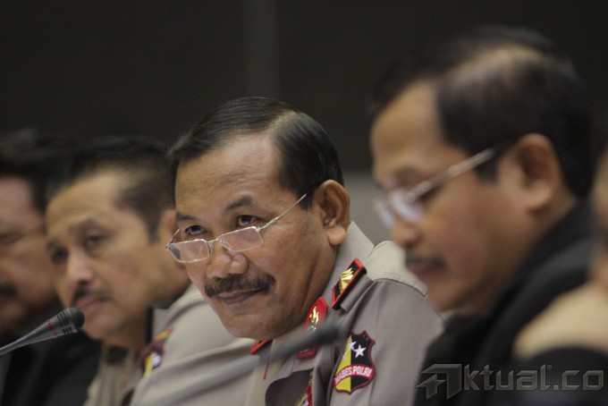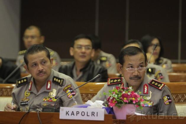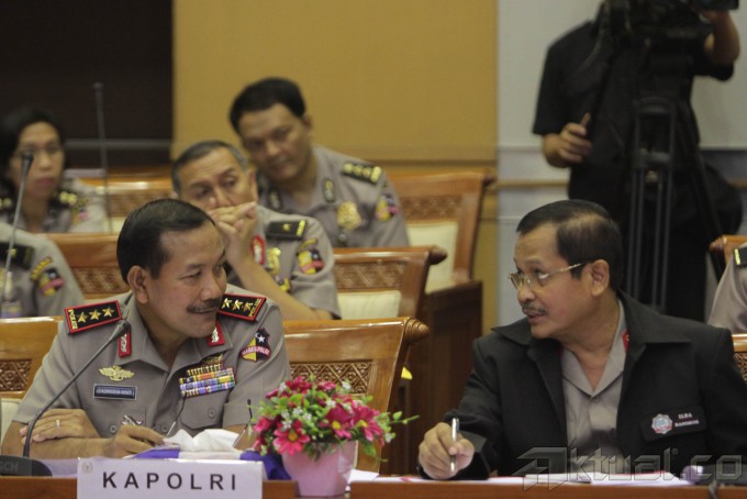 Wakapolri Komjen Pol. Badrodin Haiti (tengah) didampingi Inspektur Pengawas Umum (Irwasum) Polri Komjen Pol. Anton Bachrul Alam (kiri), dan Asisten bidang Perencanaan Umum dan Pengembangan (Asrena) Kapolri Irjen Pol. Sulistyo Ishak (kanan) mengikuti rapat kerja dengan Kmoisi III DPR, di Kompleks Parlemen Senayan, Jakarta, Rabu (2/7/2014). Rapat ini membahas anggaran seragam Polisi Wanita (Polwan) khususnya pengadaan seragam jilbab bagi Polwan. Aktual/Tino Oktaviano
