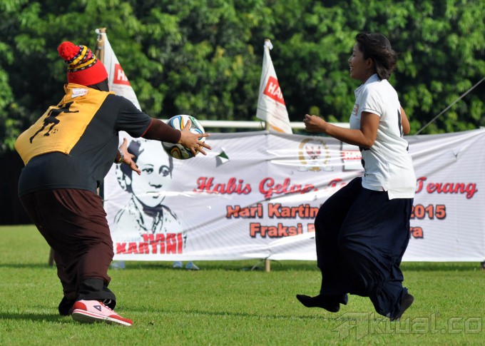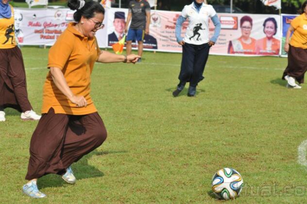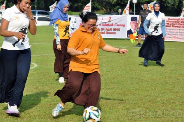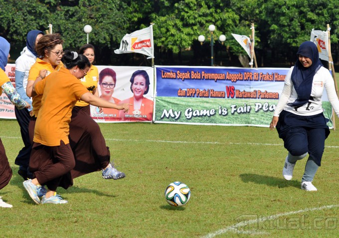 Ketua DPP Partai Hanura Miryam S Haryani dari tim sepak bola wanita Fraksi Hanura DPR RI dikawal ketat tim pengamanan dalam (Pamdal) DPR RI saat bertanding di lapangan sepak bola Kompleks Parlemen, Senayan, Jakarta, Selasa (21/4/2015). Pertandingan tersebut digelar dalam rangka peringatan hari Kartini. AKTUAL/JUNAIDI MAHBUB