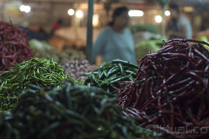 Bahan pangan berupa cabai dijual di Pasar Klender, Jakarta, Rabu (30/7). Harga pangan yang terkendali mengakibatkan inflasi bulan Juli cukup rendah yaitu sebesar 0,74 persen, meskipun bulan Juli bersamaan dengan bulan Ramadan, Lebaran serta tahun ajaran baru yang biasanya mengakibatkan inflasi tinggi. ANTARA FOTO/Rosa Panggabean