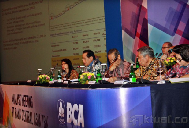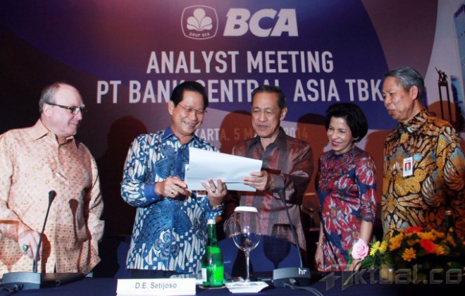 Dari kiri ke kanan, Wakil Presiden Direktur PT Bank Central Asia Tbk Eugene Keith Galbraith, Presiden Direktur Jahja Setiaatmadja, Direktur DE Setijoso, Direktur Dhalia M Ariotedjo dan Direktur Suwignyo Budiman (kiri kekanan) berbincang disela-sela acara jumpa pers hasil kinerja tahun 2013 di Jakarta, Rabu (5/3). PT Bank Central Asia Tbk menyatakan laba bersihnya selama 2013 mencapai Rp 14,3 triliun. “Meningkat 21,6 persen dibanding tahun 2012 yang tercatat Rp 11,7 triliun. Aktual/Tino Oktaviano