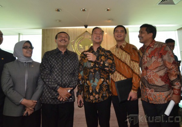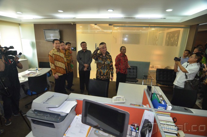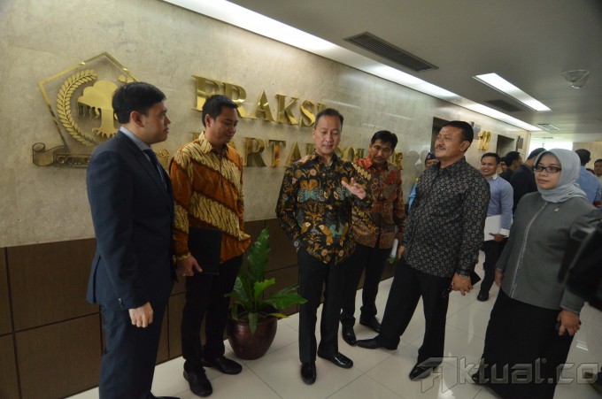 Ketua Fraksi Partai Golkar yang baru, Agus Gumiwang (tengah) didampingi Sekretaris Fraksi Fayakhun Andriadi (kedua kanan) dan Bendahara Fraksi Eni Maulani Saragih (kiri) bersama sejumlah loyalisnya berbincang saat meninjau kantor Fraksi Partai Golkar Kompleks Parlemen Lantai 12 Kompleks Parlemen Senayan, Jakarta Selatan, Senin (23/3/2015). AKTUAL/JUNAIDI MAHBUB
