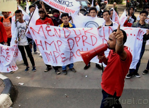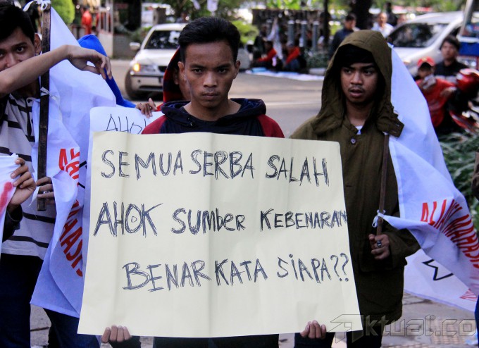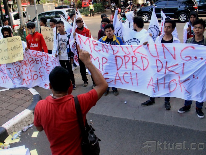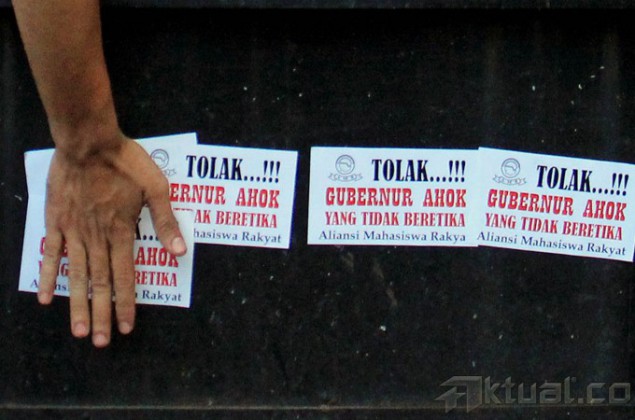 Tangan pengunjuk rasa menempelkan stiker yang bertuliskan “Tolak Gubenur Ahok Yang Tidak Beretika” di gerbang DPRD DKI Jakarta, Senin (6/4/2015). Ratusan massa yang tergabung dalam Aliansi Mahasiswa Rakyat melakukan aksi untuk mendukung Tim Hak Angket dan DPRD DKI dalam hak menyatakan pendapat kepada Ahok. AKTUAL/MUNZIR