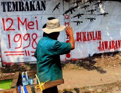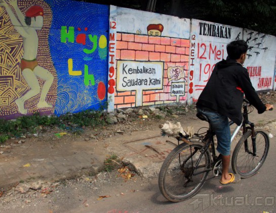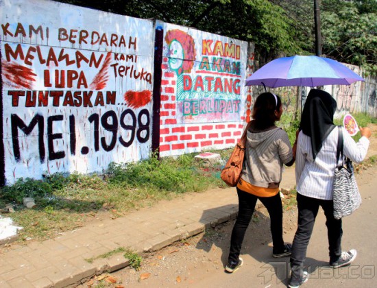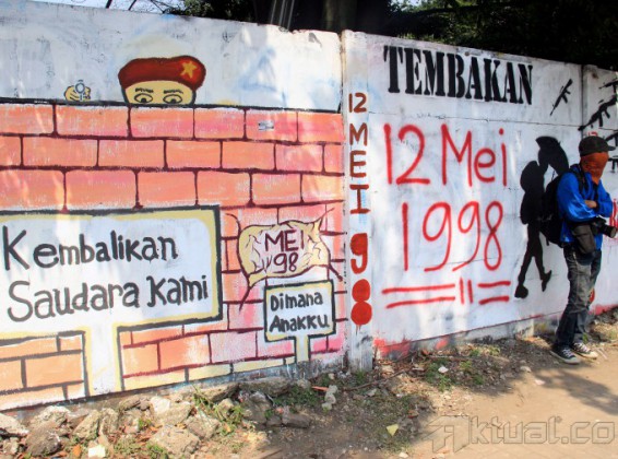 Seorang warga melintas mural bertulisakan 17 tahun reformasi di Jalan Pemuda, Rawamangun, Jakarta, Selasa (12/5/2015). Mural tersebut dibuat untuk mengenang tragedi 12 Mei 1998 dimana terjadi penembakan empat mahasiswa Trisakti, penculikan dan pelanggaran HAM. Pemerintah tidak mempunyai niat untuk menyelesaikan tragedi tersebut. AKTUAL/MUNZIR