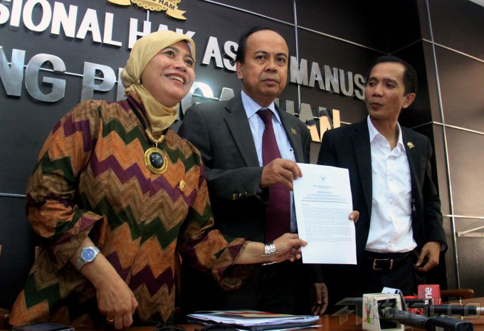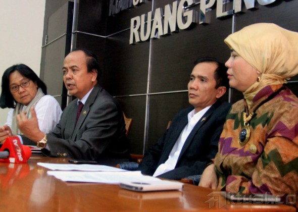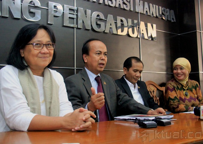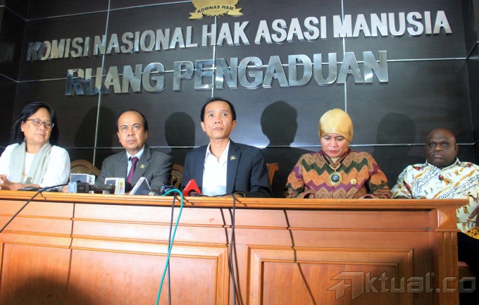Ketua Komnas HAM Hafid Abbas (kedua kiri) didampingi Ketua Tim Investigasi Komnas Ham Nur Kholis (kedua kanan), Wakil Ketua Tim Investigasi Sandrayati Moniaga (kiri), serta juru bicara Tim Investigasi Roichatul Aswidah (kanan) memaparkan hasil investigasi pada kasus dugaan kriminalisasi Wakil Ketua KPK Bambang Widjojanto, Jakarta, Rabu (4/2). Hasil Investigasi menyimpulkan bahwa dugaan kriminalisasi pimpinan KPK merupakan tindakan penyalahgunaan kekuasaan/kewenangan oleh Kepolisian RI, ditunjukan dengan adanya penggunaan senjata laras panjang dan pemborgolan saat penahanan BW tanpa surat panggilan pemeriksaan. AKTUAL/MUNZIR