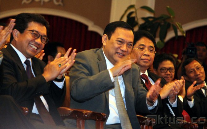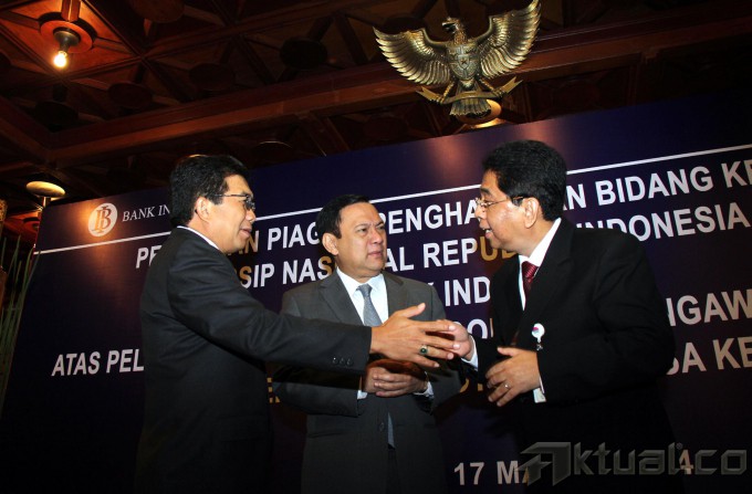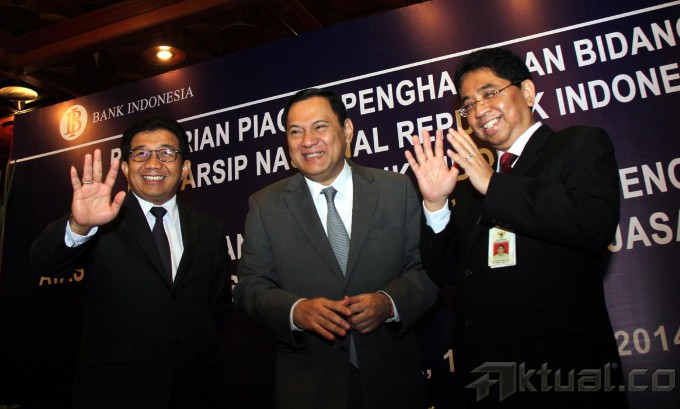 Ketua Dewan Komisioner Otoritas Jasa Keuangan (OJK) Muliaman D Hadad, Gubernur Bank Indonesia Agus Martowardojo dan Kepala Arsip Nasional Republik Indonesi (ANRI) Mustari Irawan (kiri kekanan) berbincang disela-sela acara Bank Indonesia terima penghargaan dari ANRI di Jakarta, Senin (17/3/2014). Bank Indonesia menerima penghargaan dari ANRI atas kinerja dalam pelaksanaan alih dokumen pengaturan dan pengawasan bank kepada OJK. Aktual/Tino Oktaviano