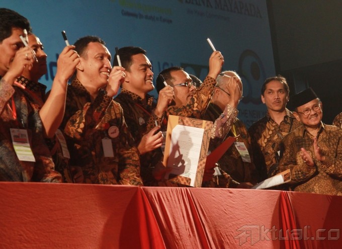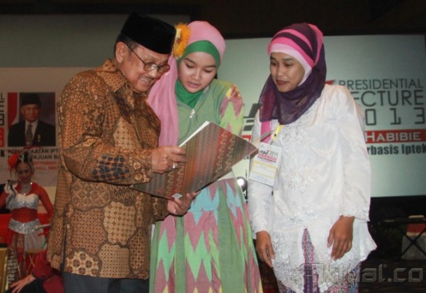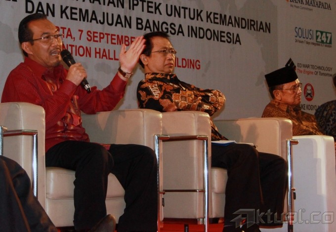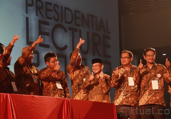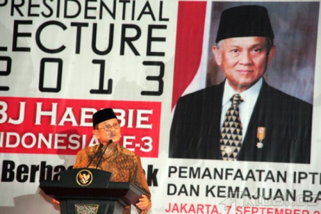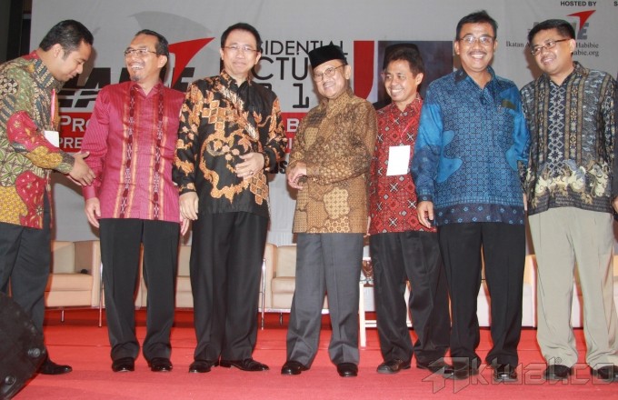 Mantan Presiden RI ketiga BJ Habibie (tengah), berbincang dengan Mentan Suswono (kedua dari kiri), Ketua DPR Marzuki Alie (ketiga dari kiri), saat acara Habibie pada presidential lecturer ‘Membangun Indonesia Berbasis Iptek’ di Gedung Smesco Sabtu (7/9). Dalam kesempatan tersebut Habibie mengungkapkan peran penting teknologi bukan hanya pada pembuatan kapal, smartphone, atau kapal terbang. Hal-hal seperti menulis artikel atau buku, agar bernilai tambah juga membutuhkan teknologi dan memikirkan skenario kehidupan juga butuh teknologi. Aktual/Tino Oktaviano