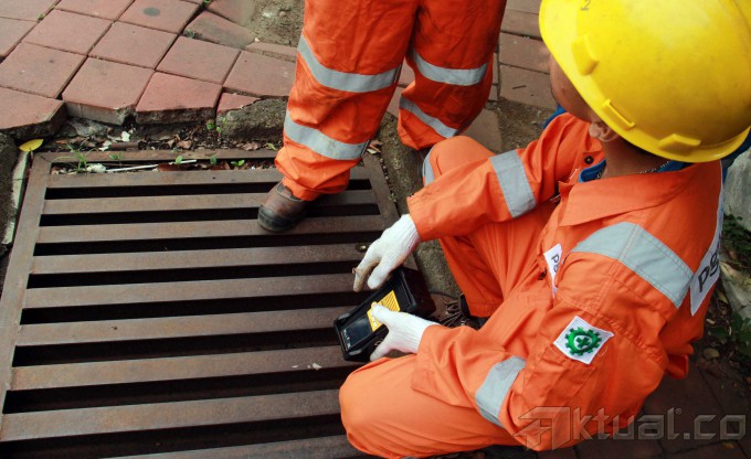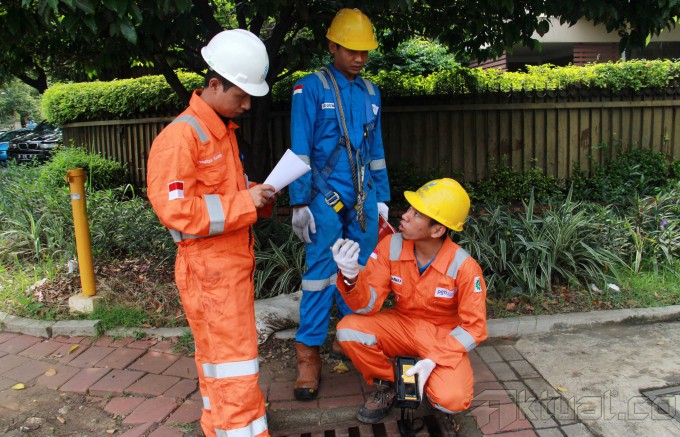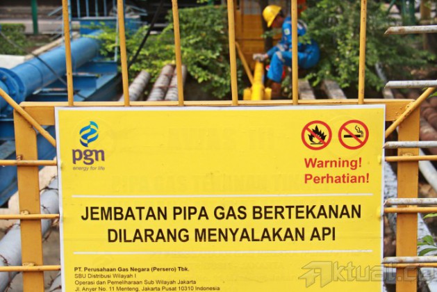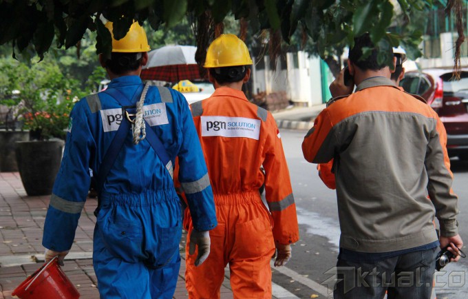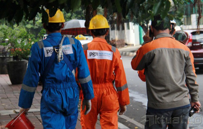 Petugas PT Perusahaan Gas Negara (Persero) Tbk (PGAS) merawat pipa sambuangan gas di kawasan Menteng, Jakarta Pusat, Rabu (19/2/2014). PGAS menggelar program satu juta sambungan rumah tangga berjuluk `PGN Sayang Ibu.` Program tersebut untuk menambah 100 ribu rumah tangga yang sudah menjadi pelanggan. Sampai saat ini PGAS memiliki 6.000 kilo meter sambungan pipa dan seratus ribu pelanggan rumah tangga dan tahun ini meluncurkan program sambungan 1 juta rumah tangga. Aktual/Tino Oktaviano