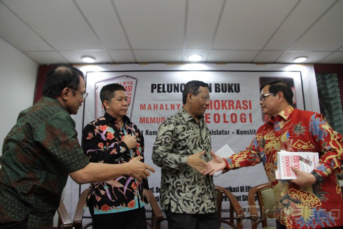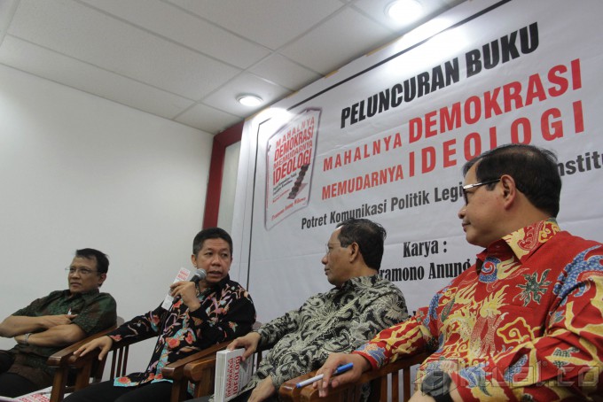 Dari kanan ke kiri, Wakil Ketua DPR Pramono Anung, Mantan Ketua MK Mahfud MD, Pakar Komunikasi Effendi Ghazali, dan Peneliti Senior CSIS J. Kristiadi menjadi pembicara dalam diskusi bedah buku bertajuk Mahalnya Demokrasi Memudarnya Ideologi di Kompleks Parlemen Senayan, Jakarta, Selasa (3/12/2013). Buku karya Pramono Anung tersebut mengungkap beberapa fakta soal DPR hingga tingginya biaya dalam proses pemilu. Aktual/Tino Oktaviano