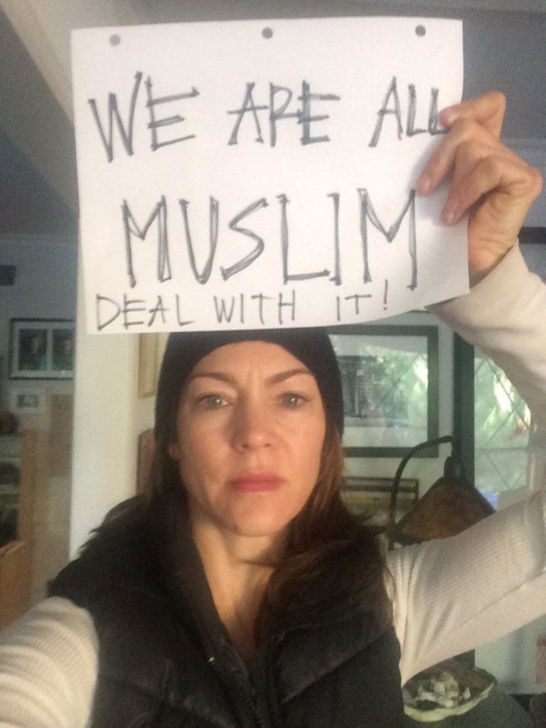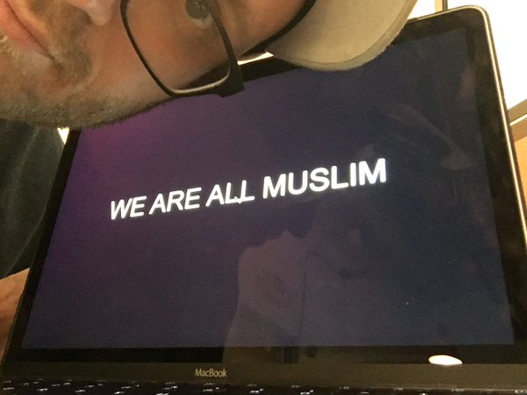 Di luar Trump Tower di kota New York, AS pada 17 Desember lalu, Moore berdiri dengan membawa secarik kertas (plakat kertas) yang bertuliskan, “Kita Semua Muslim”.