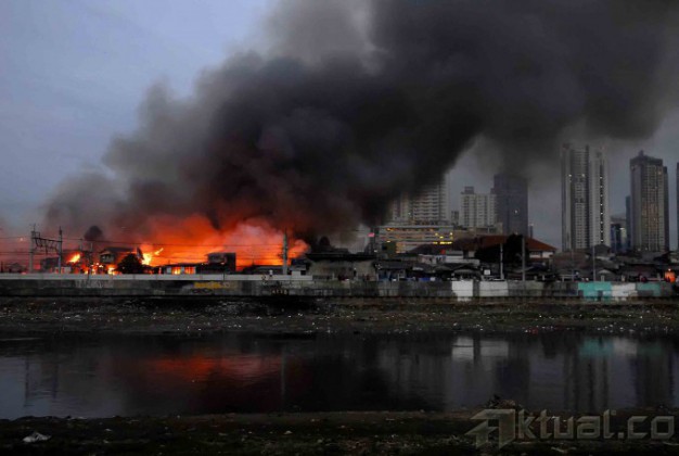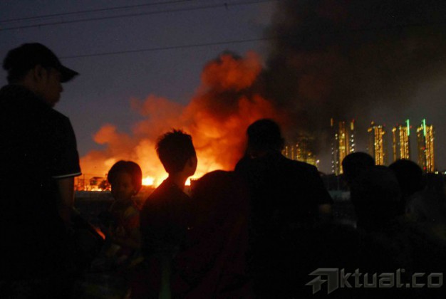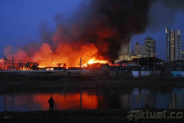 Warga berusaha memadamkan api yang menghanguskan perumahan padat penduduk di Kawasan Kebon Melati, Jakarta Pusat, Kamis (5/3/2015). Sedikitnya 23 unit mobil Dinas Pemadam Kebakaran dikerahkan untuk memadamkan api. AKTUAL/TINO OKTAVIANO