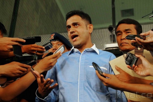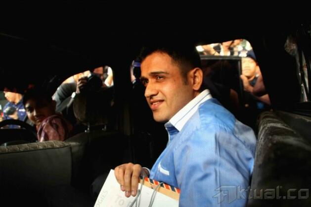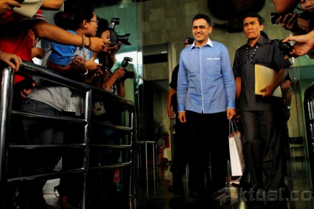 Terpidana kasus korupsi Hambalang, Muhammad Nazaruddin tersenyum menyapa awak media usai menjalani pemeriksaan di KPK, Jakarta, Jumat (25/10/2013). Mantan Bendahara Umum Partai Demokrat tersebut kembali diperiksa KPK sebagai saksi kasus korupsi Pusat Olahraga Hambalang untuk tersangka Anas Urbaningrum. Aktual/Oke Dwi Atmaja