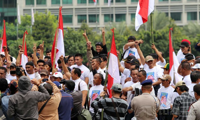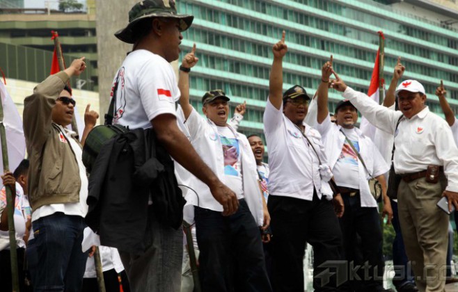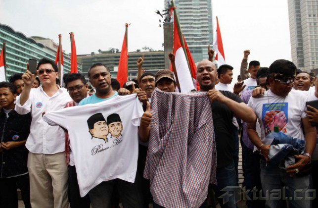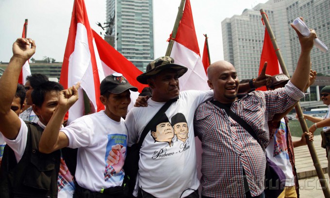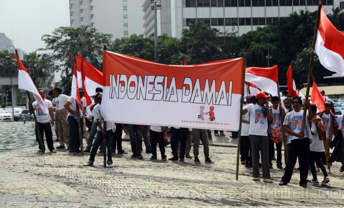 Para pendukung Prabowo dan pendukung Jokowi melakukan aksi damai bersama di Bundaran HI, Jakarta, Senin (21/7/2014). Mereka menyerukan Indonesia damai saat pengumuman resmi KPU pada 22 Juli mendatang. Aktual/Tino Oktaviano