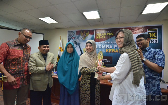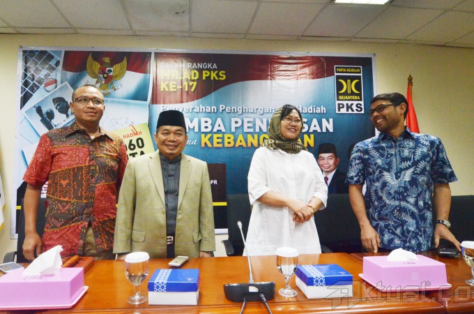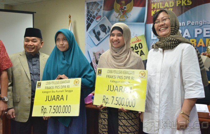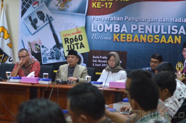 Ketua Fraksi PKS DPR, Jazuli Juwaini (kedua kiri) bersama Sekjen PKS, Taufik Ridho (kiri), Ketua Dewan Juri, Siti Zuhro (kedua kanan) dan Anggota Fraksi PKS, Nasir Djamil mengumumkan pemenang lomba penulisan bertema ‘Momentum Bangkitkan Semangat Kebangsaan’ di Aula Fraksi PKS DPR, Komleks Parlemen Senayan, Jakarta, Rabu (3/6/2015). Lomba penulisan kebangsaan yang diikuti 1526 peserta se-Indonesia ini diselenggarakan untuk membangkitkan semangat jiwa nasionalisme Indonesia di tengah arus globalisasi. AKTUAL/TINO OKTAVIANO