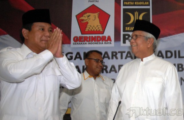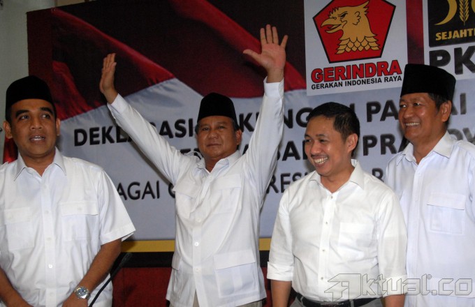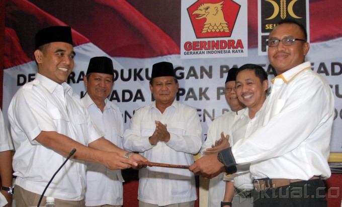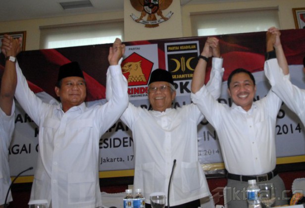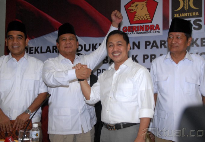 Sekjen Gerindra Ahmad Muzani, Ketua Umum Partai Gerindra Suhardi, menyaksikan Ketua Dewan Pembina Partai Gerindra Prabowo Subianto dan Presiden PKS Anis Matta, bejabat tangan saat deklarasi dukungan PKS kepada Prabowo Subianto di Kantor PKS, Jakarta, Sabtu (17/5/2014). PKS menyatakan mendukung pencapresan Prabowo Subianto sebagai Capres pada pilpres 9 Juli mendatang. Aktual/Tino Oktaviano