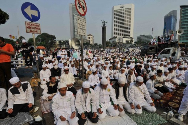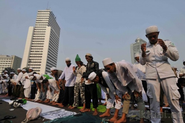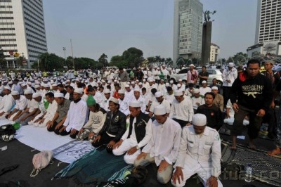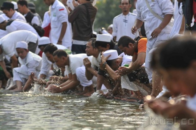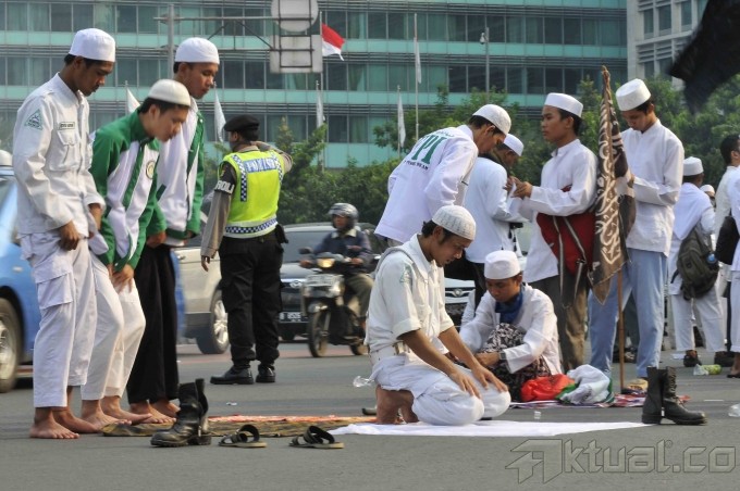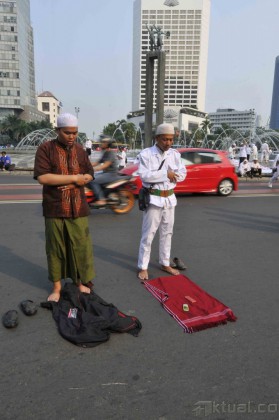 Sejumlah anggota dari Forum Umat Islam (FUI) memanfaatkan air kolam untuk berwudhu saat hendak melakukan shalat Ashar berjamaah di Bundaran Hotel Indonesia, Jakarta, Sabtu (14/9/2013). Ratusan demonstran menggelar shalat Ashar berjamaah di tengah aksi unjuk rasa menolak acara Miss World 2013 yang sedang berlangsung di Pulau Dewata, Bali. Aktual/Tino Oktaviano