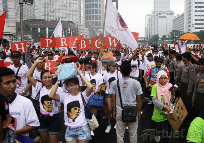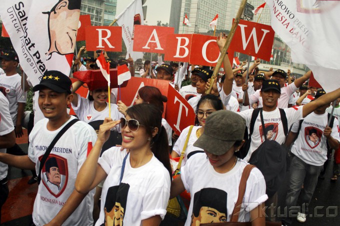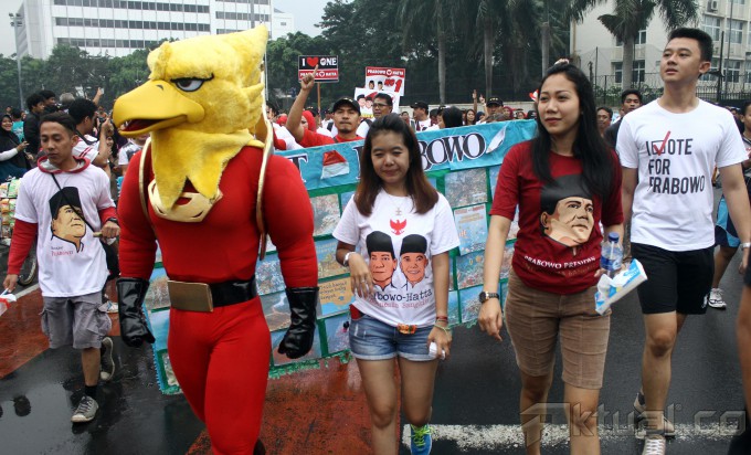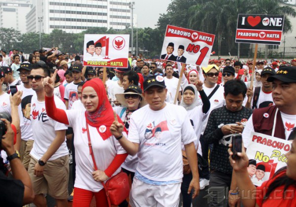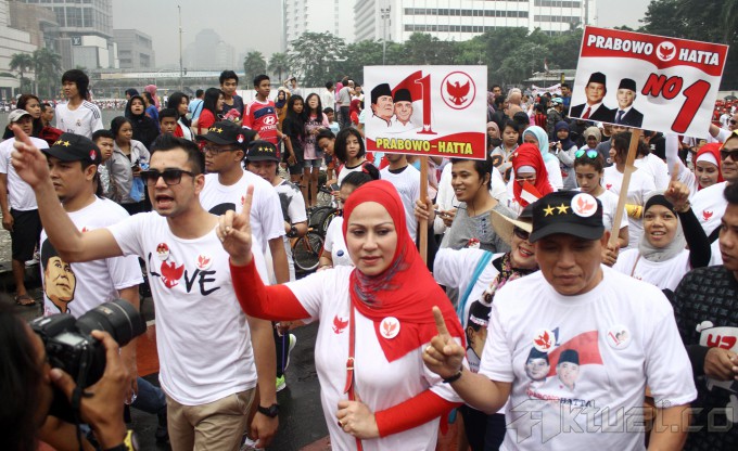 Artis Raffi Ahmad dan Camelia Malik bersama massa pendukung Prabowo-Hatta saat berkeliling di Bundaran HI, Jakarta, Minggu (15/6/2014). Aksi para simpatisan tersebut merupakan bentuk kampanye dukungan terhadap Capres-Cawapres, Prabowo-Hatta. Kampanye ini juga dimeriahkan penampilan aksi Marching Band. Aktual/Tino Oktaviano