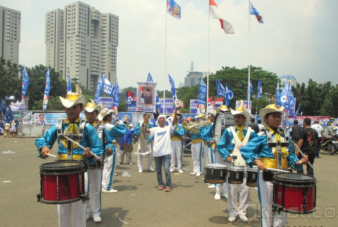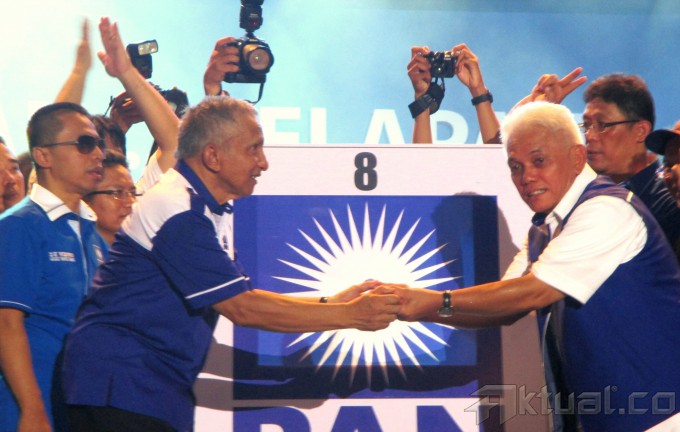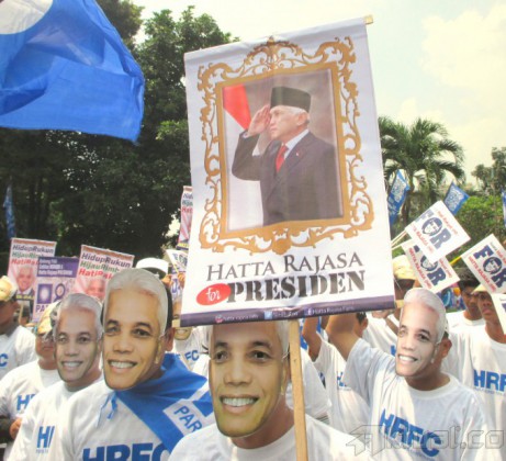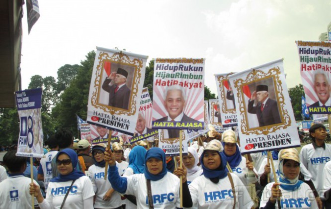 Ketua Umum Partai Amanat Nasional (PAN), Hatta Rajasa (ketiga kanan), bersama Ketua Majelis Pertimbangan PAN, Amien Rais (ketiga kiri), memperagakan simulasi pencoblosan saat kampanye akbar partai bernomor urut delapan itu di Istora Senayan, Jakarta, Kamis (3/4/2014). Partai berlambang matahari itu berharap dapat masuk tiga besar dalam Pemilu Legislatif 9 April 2014. Aktual/Ist