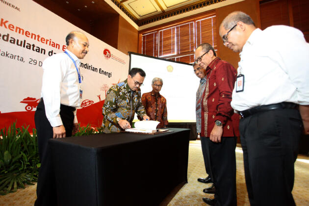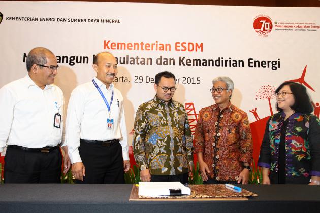 Menteri ESDM Sudirman Said (kedua kiri) didampingi Direktur Utama Pertamina Dwi Soetjipto (ketiga kiri) Dirjen Migas Wiratamaja Puja (kiri), Kepala SKK Migas Amin Sunaryadi (kanan), Direktur Utama PHONWJ Beni J Ibradi (kedua kanan) dan Direktur Utama EMP AMir Balfas (ketiga kanan) menandatangani Kontrak Pengelolaan Wilayah Kerja Migas di Jakarta, Selasa (29/12). PT Pertamina (Persero) melalui afiliasinya PT Pertamina Hulu Mahakam dan PT Pertamina Hulu Energi 'Offshore North West Java' (ONWJ) menandatangani kontrak kerjasama pengelolaan wilayah kerja Mahakam dan ONWJ . ANTARA FOTO/Muhammad Adimaja/nz/15