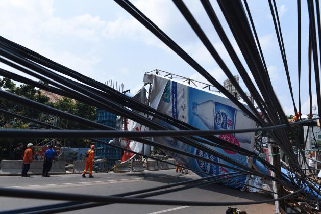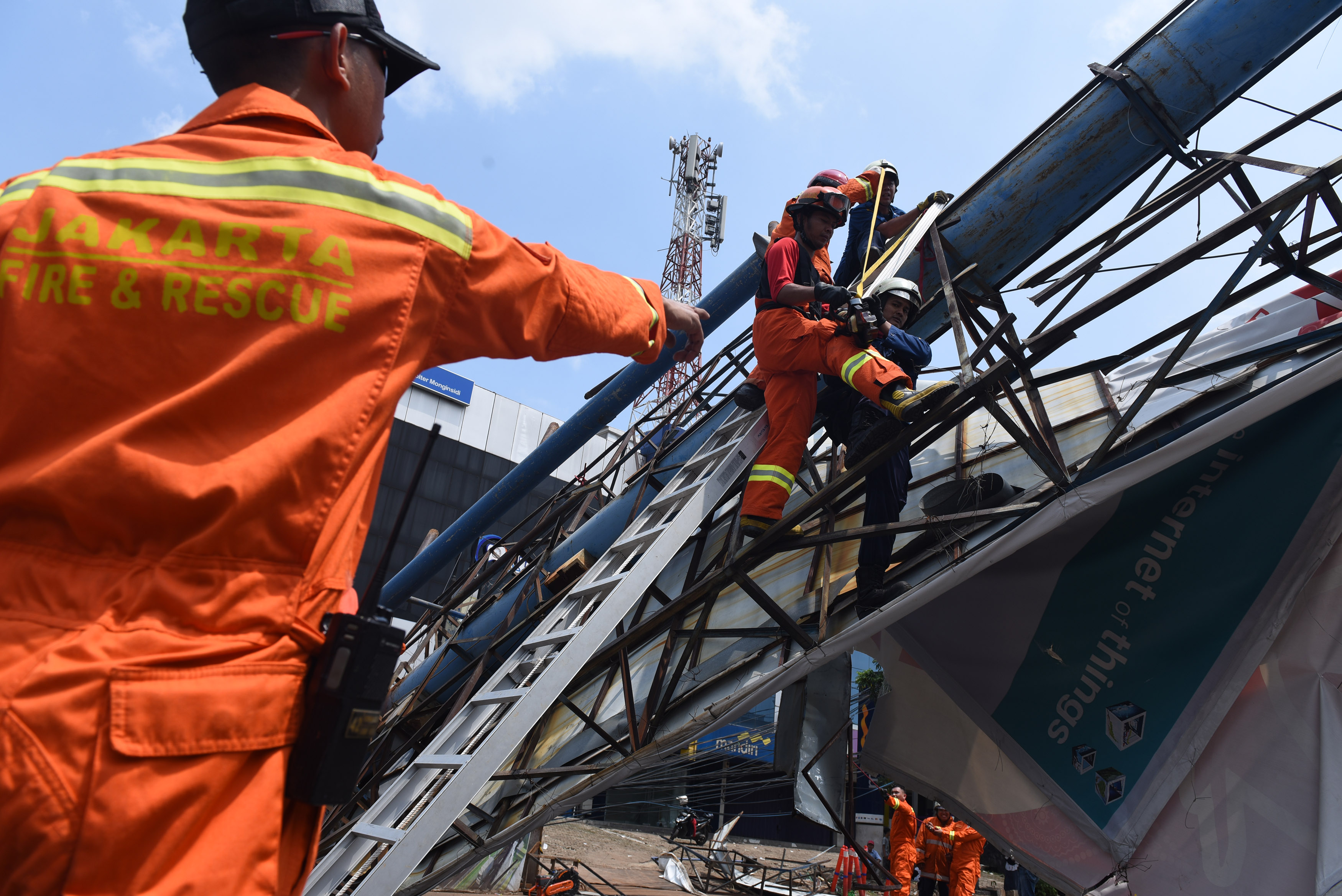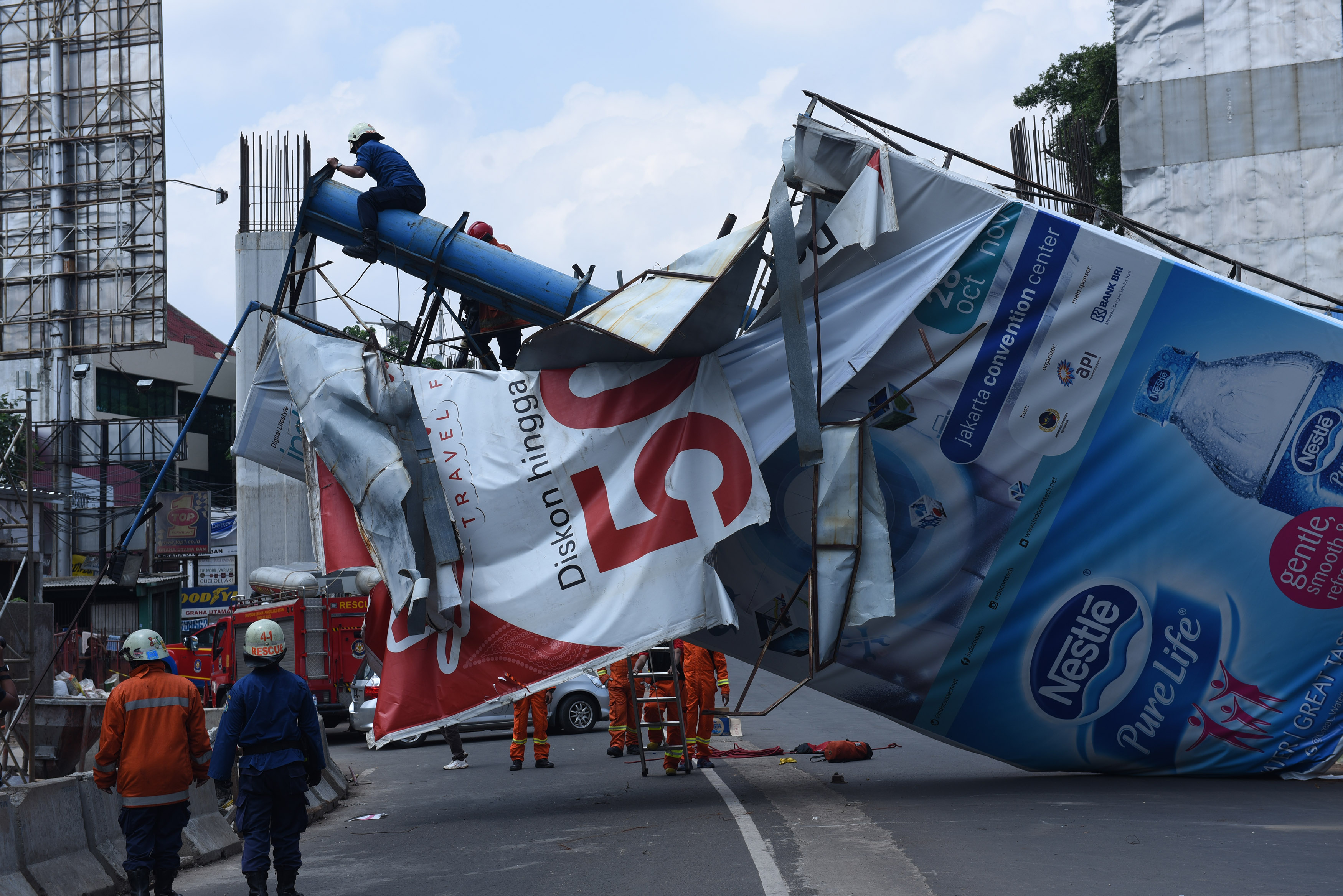 Petugas pemadam kebakaran berusaha mengevakuasi papan reklame yang roboh di Jalan Tendean, Jakarta, Jumat (1/1). Papan reklame sebesar 5x15 meter itu roboh menutupi seluruh badan jalan dan petugas masih menyelidiki penyebab robohnya reklame tersebut. ANTARA FOTO/Hafidz Mubarak A/foc/16.