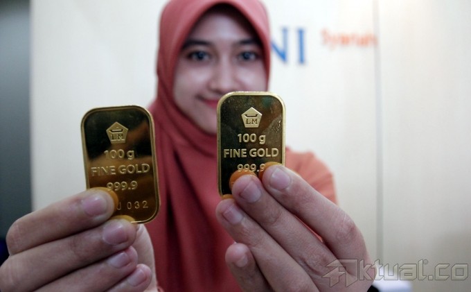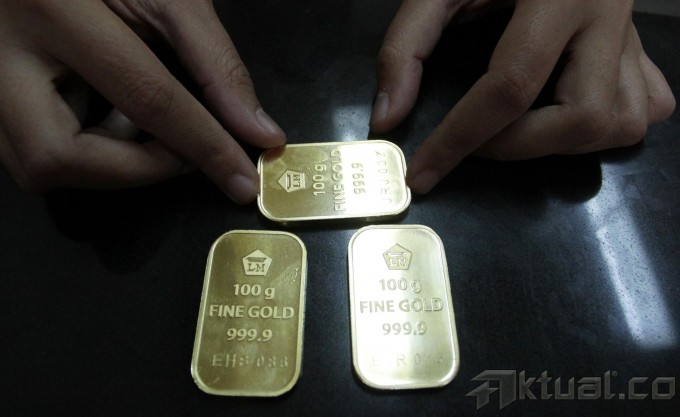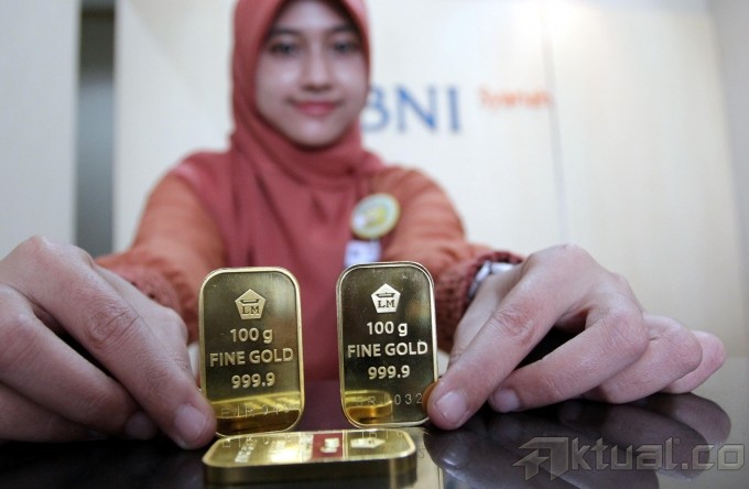 Seorang karyawan Bank memperlihatkan batangan logam emas di Bank BNI Syariah Jakarta, Selasa (22/10/2013). Perkembangan harga emas tercatat melemah di tengah penantian pasar terhadap data nonfarm payrolls, sedangkan harga emas untuk pengiriman Desember turun 0,11% menjadi US$1.314,40 per tory ounce (Rp479.266,01 per gram). Aktual/Tino Oktaviano
