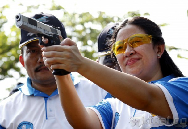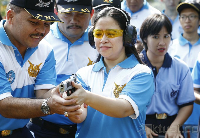 Menko PMK Puan Maharani bersiap menembak di lapangan tembak kompleks Halim Perdana Kusuma, Jakarta Timur, Sabtu (9/5), seusai olahraga bersama dengan jajaran TNI AU. Puan berharap agar SDM khususnya di TNI AU bisa lebih maju dan selaras dengan semangat revolusi mental yaitu integritas, etos kerja dan gotong royong. ANTARA FOTO/Humas Menko PMK/pras