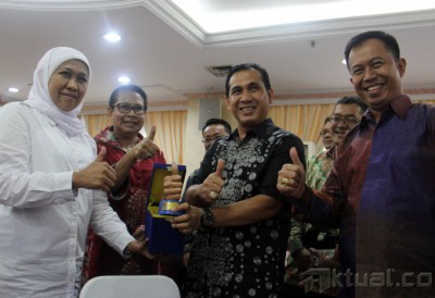 Menteri Sosial Khofifah Indar Parawansa memberi cinderamata kepada Menteri Pemberdayaan Perempuan dan Perlindungan Anak Yohana Susana Yembise usai melakukan pertemuan di Jakarta, Selasa (28/4/2015). Pertemuan tersebut dalam rangka membahas kerjasama pemenuhan kebutuhan dasar anak. AKTUAL/JUNAIDI MAHBUB