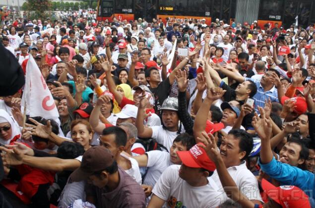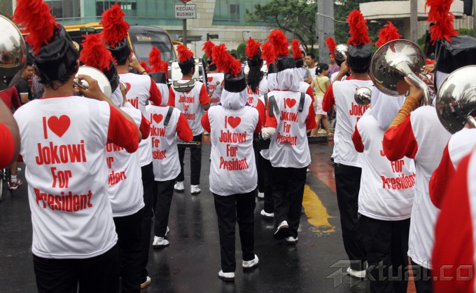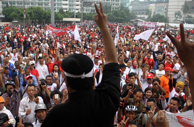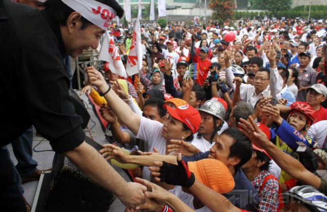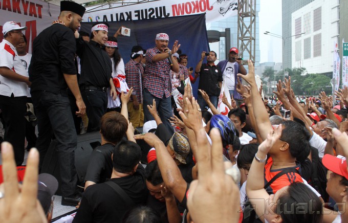 Anak Bungsu Soekarno, Guruh Soekarno Putra berkampanye dukung Jokowi-JK saat acara senam dan goyang pagi bersama di depan Patung Sudirman Jalan Sudirman, Jakarta Pusat, Minggu (15/6/2014). Relawan Jokowi yang tergabung dalam Masyarakat Jabodetabek berkumpul untuk senam pagi dan bergoyang bersama untuk mendegarkan lagu yang diciptakan Joe Bangkit berjudul Goyang Jokowi. Selain itu juga ada video Joint Jokowi yang dinyanyikan dengan bahasa daerah dan Indonesia. Aktual/Tino Oktaviano
