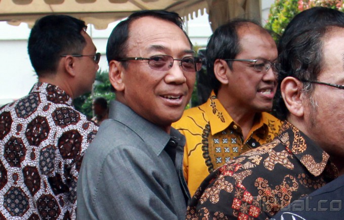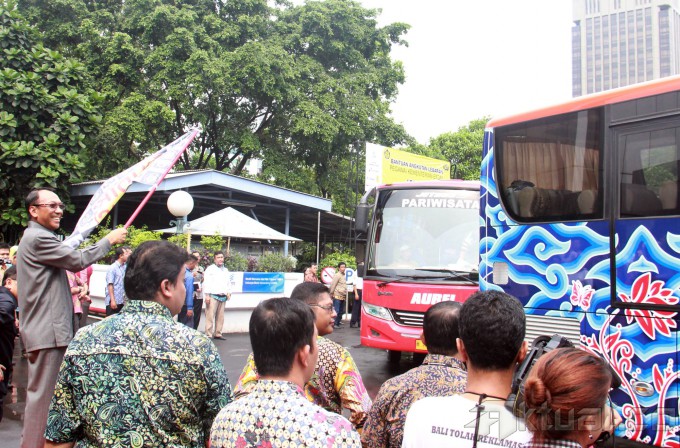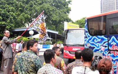 Menteri Energi dan Sumber Daya Mineral (ESDM), Jero Wacik melepas mudik bareng di kantor Kementerian ESDM, Jakarta, Jumat (25/7/2014). Kementerian ESDM memberangkatkan 1248 pemudik menuju berbagai daerah di pulau Jawa. Para pemudik ini merupakan pegawai ESDM golongan I dan golongan II serta tenaga honorer. Para pemudik tidak dikenakan biaya untuk bisa pulang ke kampung halaman. Sebanyak 31 armada bis disediakan yang merupakan hasil kerjasama antara Kementerian ESDM dan para badan usaha di sektor ESDM. Aktual/Tino Oktaviano
