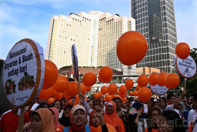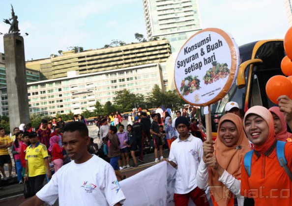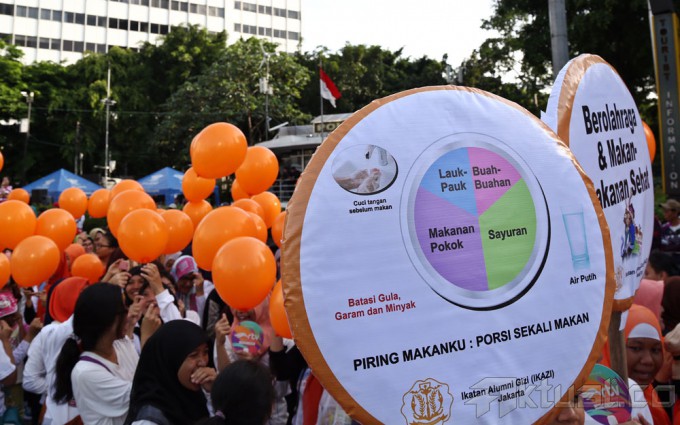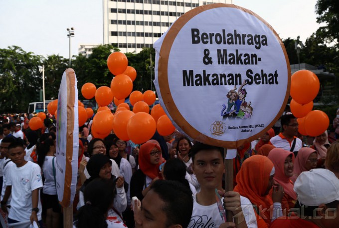 Sejumlah staf Kementrian Kelauatan dan Perikanan bersama warga lakukan kampanye ajakan berolahraga dan makan makanan sehat dalam rangka memperingati Hari Gizi Nasional di kawasan Bundaran HI, Jakarta, Minggu (25/1/2015). Pada kegiatan tersebut mereka mengampanyekan Gerakan Memasyarakatkan Makan Ikan (Gemar ikan). AKTUAL/MUNZIR