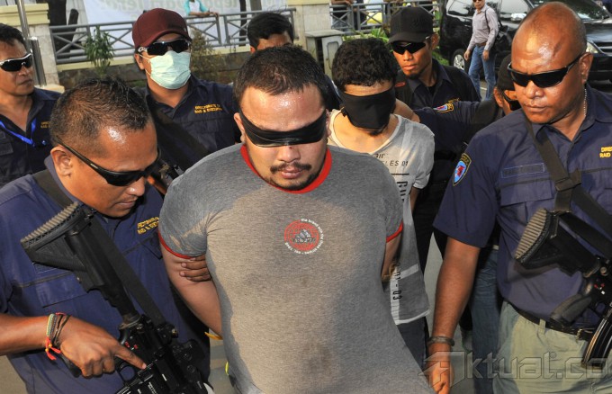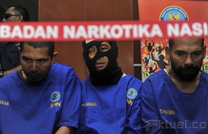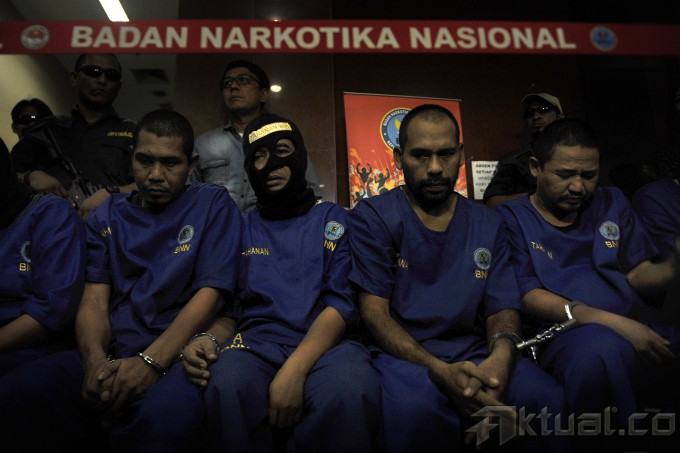 Narapidana narkotika terdiam saat rilis penangkapan napi narkotika yg sempat kabur dari rutan di kantor BNN, Jakarta, Sabtu (9/5). BNN berhasil meringkus kembali 9 dari 10 narapidana yang sempat kabur dari rutan, serta empat orang yang membantu pelarian termasuk oknum petugas rutan. ANTARA FOTO/Puspa Perwitasari