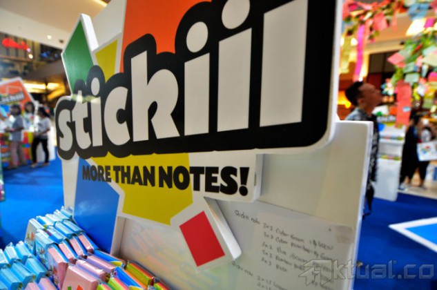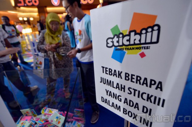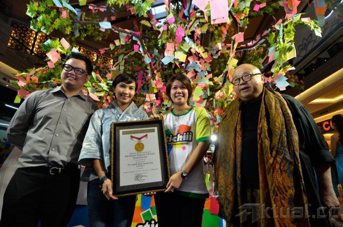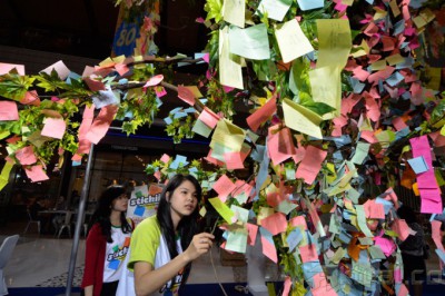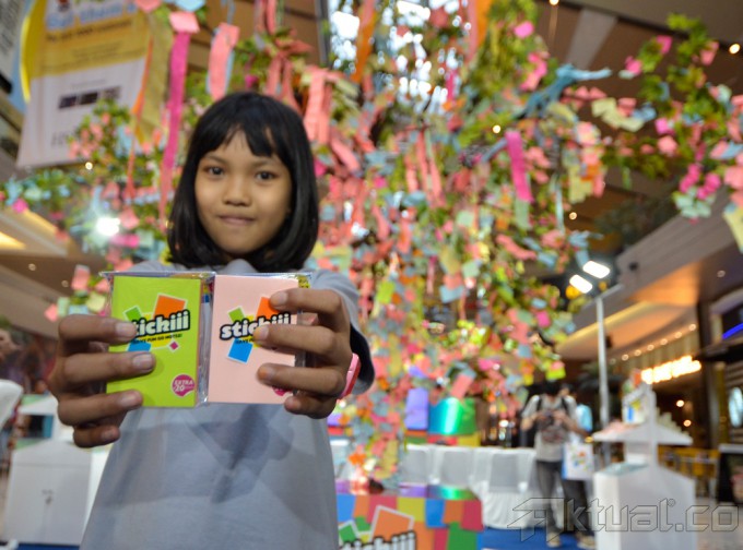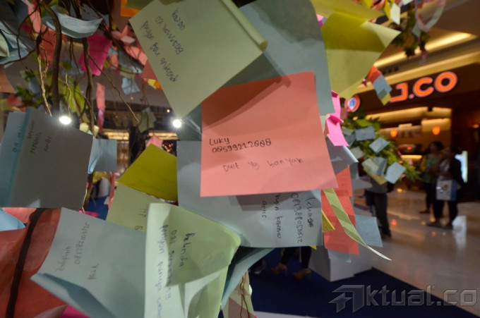 Seorang pengunjung melihat tulisan harapan yang ditulis saat penganugerahan rekor muri penempelan terbanyak stickii pada sebuah pohon di mall Kota Kasablanka, Jakarta Selatan, Jumat (20/12/2012). 12000 stickii berisi harapan dari hasil kunjungan ke perkantoran dan kampus yang dikumpulkan dari bulan Juni ditempel pada sebuah pohon yang akan dipajang dari hari ini sampai tanggal 22 desember 2013 di dalam mall Kota Kasablanka. Aktual/Roni Kuncoro