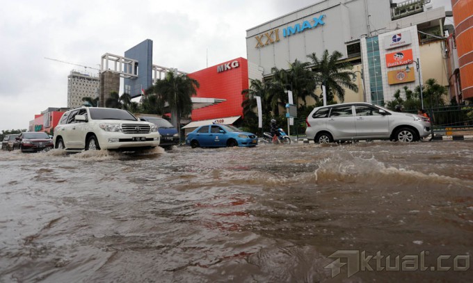 Sejumlah pengendara melintas jalanan yang tergenang di Jalan Boulevard Barat Raya, Kelapa Gading, Jakarta Utara, Jumat (17/1/2014). Banjir setinggi 50 cm itu sempat melumpuhkan lalu lintas di kawasan tersebut, Namun keadaan ini membuat warga kawasan elit itu waspada jika terjadi banjir. Aktual/Tino Oktaviano