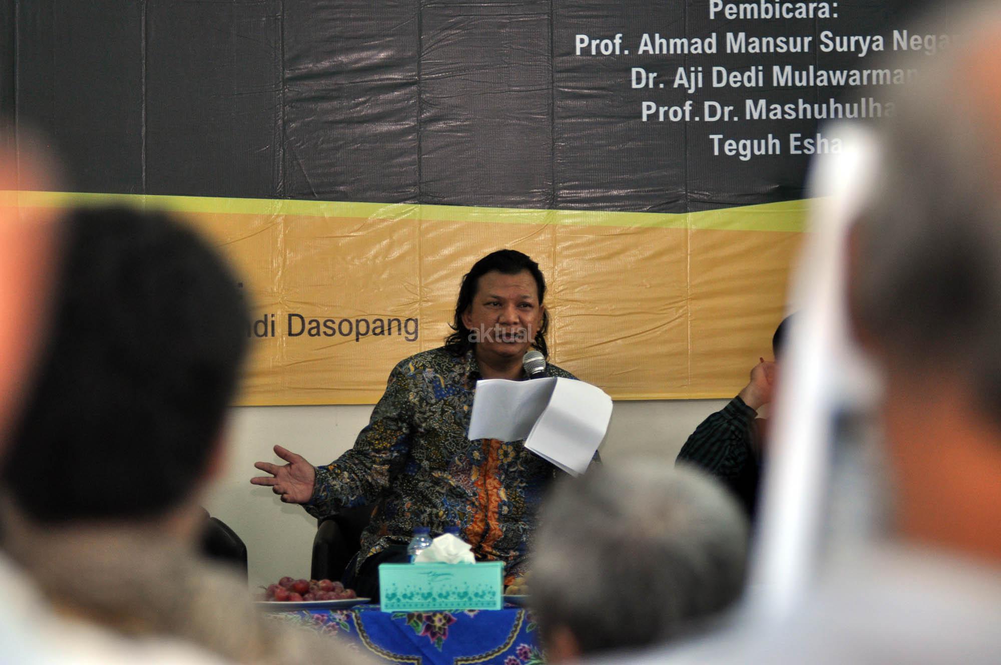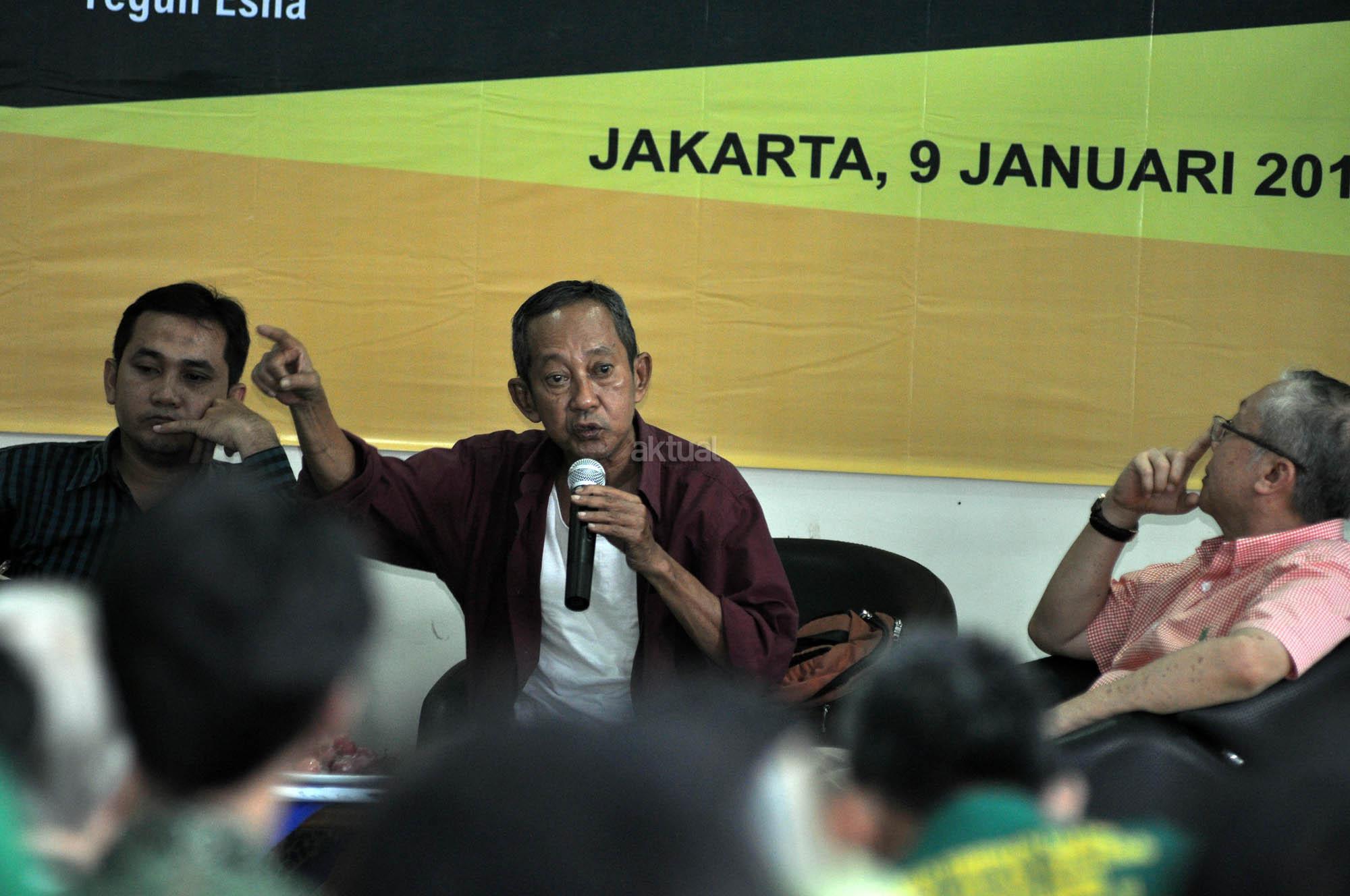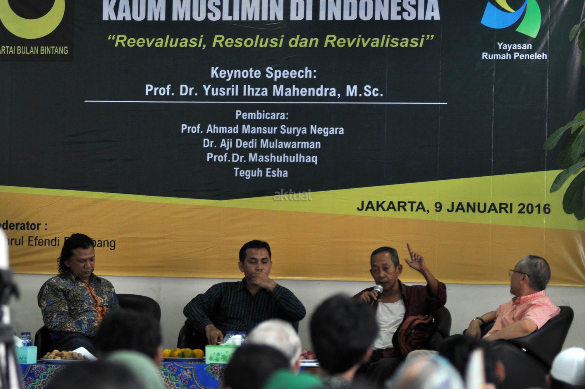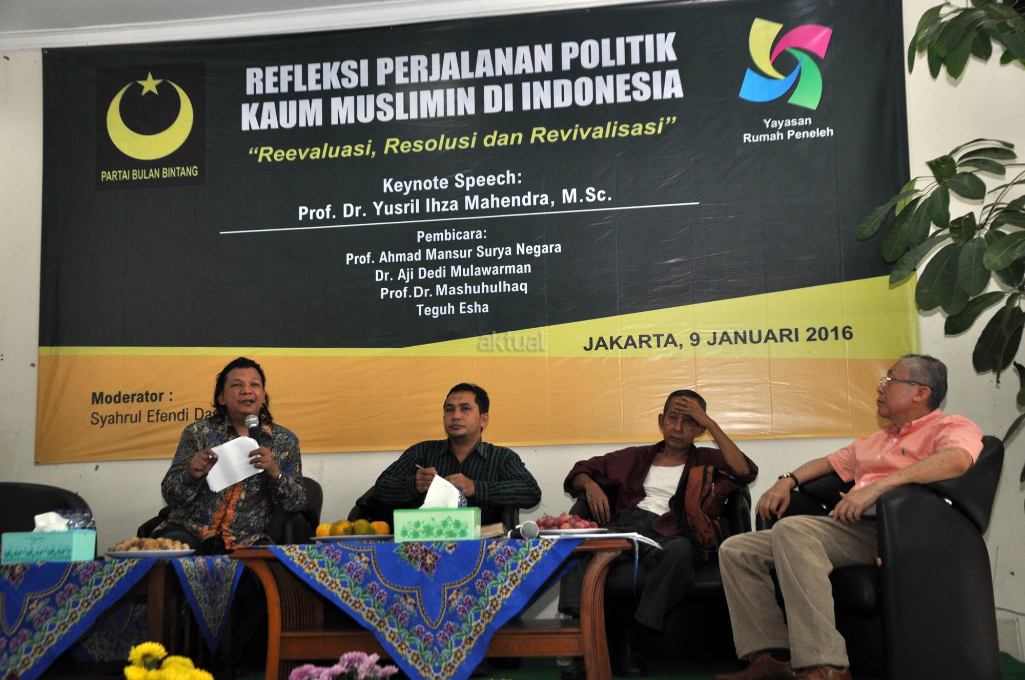 Dari kiri ke kanan, Akademisi, Aji Dedi Mulawarman, Penulis Novel Ali Topan Anak Jalanan, Teguh Esha dan Mashuhulhaq menjadi narasumber dalam acara diskusi di Kantor DPP Partai Bulan Bintang (PBB), Jalan Pasar Minggu, Jakarta, Sabtu (9/1/2016). Diskusi bertema "Refleksi perjalanan politik kaum Muslimin di Indonesia". AKTUAL/JUNAIDI MAHBUB