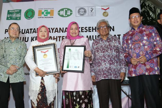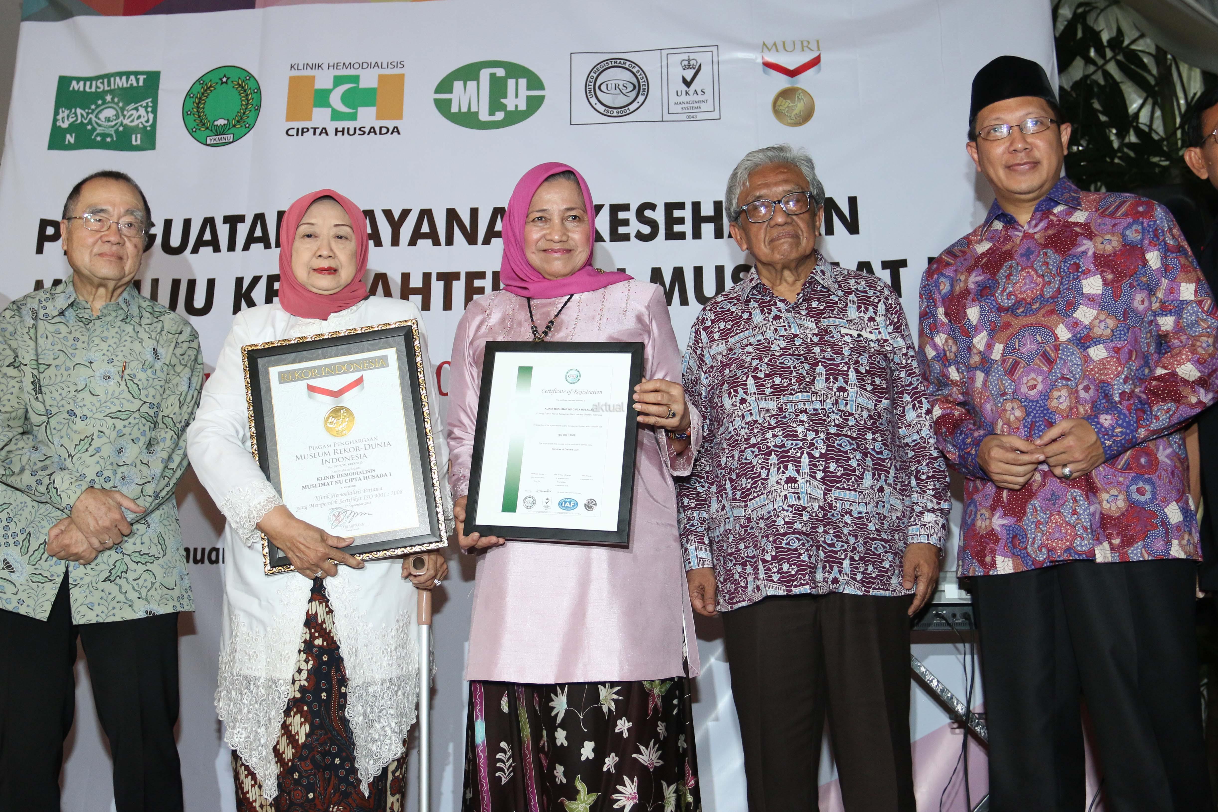 Ketua Yayasan Kesejahteraan Muslimat NU (YKMNU) Farida Slahudin Wahid (tengah) bersama Pembina YKMNU Aisyah Hamid Baidlowi (kedua kiri) menerima Sertifikat ISO dan Rekor Muri disaksikan Menteri Agama Lukman Hakim Saifuddin (kanan), salah satu pendiri Klinik Hemodialisis Cipta Husada Dr. Umar Wahid (kedua kanan) dan Direktur Medis PT. Masa Cipta Husada Agus Hendro Susanto (kiri) saat penyerahan Rekor Muri Cuci Darah terbanyak di Klinik Hemodialisis Cipta Husada, Jakarta, Minggu (10/1/2016). Klinik Cipta Husada berhasil melakukan lebih dari 70.000 tindakan cuci darah dengan 23 mesin cuci darah merek Gambro, jumlah tindakan rata rata 1200 kali perbulan dan Pasien tersebut gratis melakukan cuci darah bekerja sama dengan BPJS. AKTUAL/JUNAIDI MAHBUB