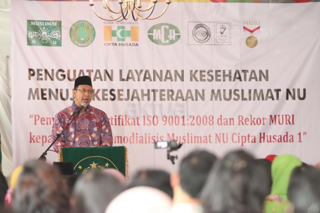 Menteri Agama Lukman Hakim Saifuddin saat menyampaikan sambutan di acara penyerahan sertifikat ISO dan Rekor Muri cuci darah di Klinik Hemodialisis Cipta Husada, Jakarta, Minggu (10/1/2016). Klinik Cipta Husada berhasil melakukan lebih dari 70.000 tindakan cuci darah dengan 23 mesin cuci darah merek Gambro, jumlah tindakan rata rata 1200 kali perbulan dan Pasien tersebut gratis melakukan cuci darah bekerja sama dengan BPJS. AKTUAL/JUNAIDI MAHBUB