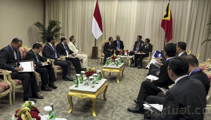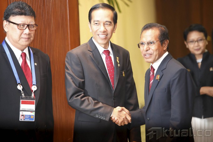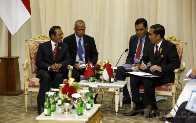 Presiden Joko Widodo (kedua kiri) berbincang dengan Presiden Timor Leste, Taur Matan Ruak (kanan) saat melakukan pertemuan bilateral di sela-sela penyelenggaraan Konferensi Tingkat Tinggi (KTT) Asia Afrika tahun 2015 di Jakarta Convention Center, Kamis (23/4). aacc2015/Jerry Adiguna