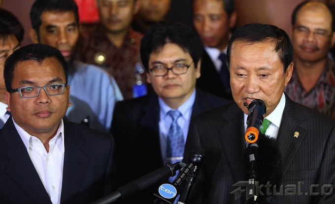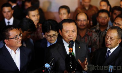 Menteri Hukum dan Ham (Menkumham) Amir Syamsudin (tengah) didampingi Wamenkumham Denny Indrayana (kiri) memberikan keterangan kepada wartawan saat konfrensi pers terkait pembebasan bersyarat terpidana kepemilikan 4,1 kg Mariyuana, Schapelle Leigh Corby di Kementerian Hukum dan HAM, Jakarta, kemarin (7/2/2014). Menkumham menjelaskan bahwa pelaksanaan pembebasan bersyarat tersebut akan diserahkan ke UPT (Unit Pelaksanaan Teknis) Kantor Wilayah (Kanwil) Kemkumham Bali karena Corby menjalani penahanan di Bali. Aktual/Tino Oktaviano
