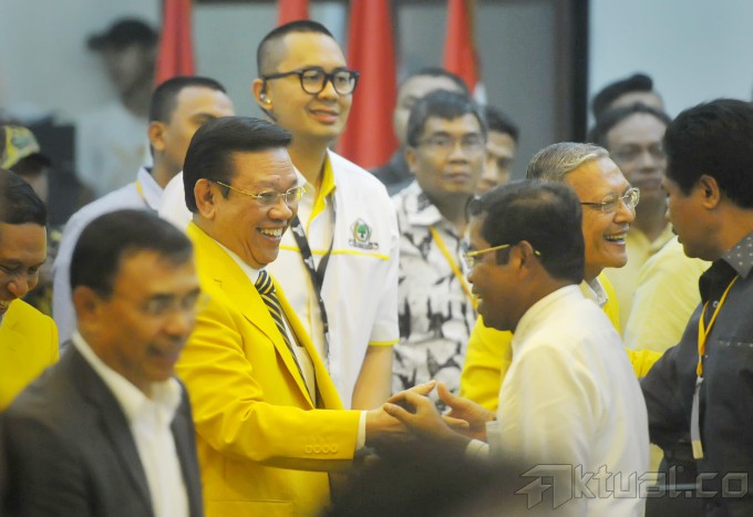 Politisi Golkar pendukung Munas Ancol Priyo Budi Santoso (kiri) bersalaman dengan politisi Golkar pendukung Munas Bali Nurdin Halid (kanan), Fadel Muhammad (kedua kanan) serta Idrus Marham (kedua kiri) usai sidang Mahkamah Partai Golkar di Kantor DPP Partai Golkar, Jakarta, Rabu (25/2). Sidang MP Golkar terkait dualisme kepengurusan Partai Golkar tersebut digelar dengan agenda pemeriksaan saksi serta mendengarkan jawaban pihak termohon yaitu pengurus DPP Partai Golkar versi Munas Bali yang diketuai oleh Aburizal Bakrie, putusan akan dibacakan pada Rabu (4/3). ANTARA FOTO/Yudhi Mahatma