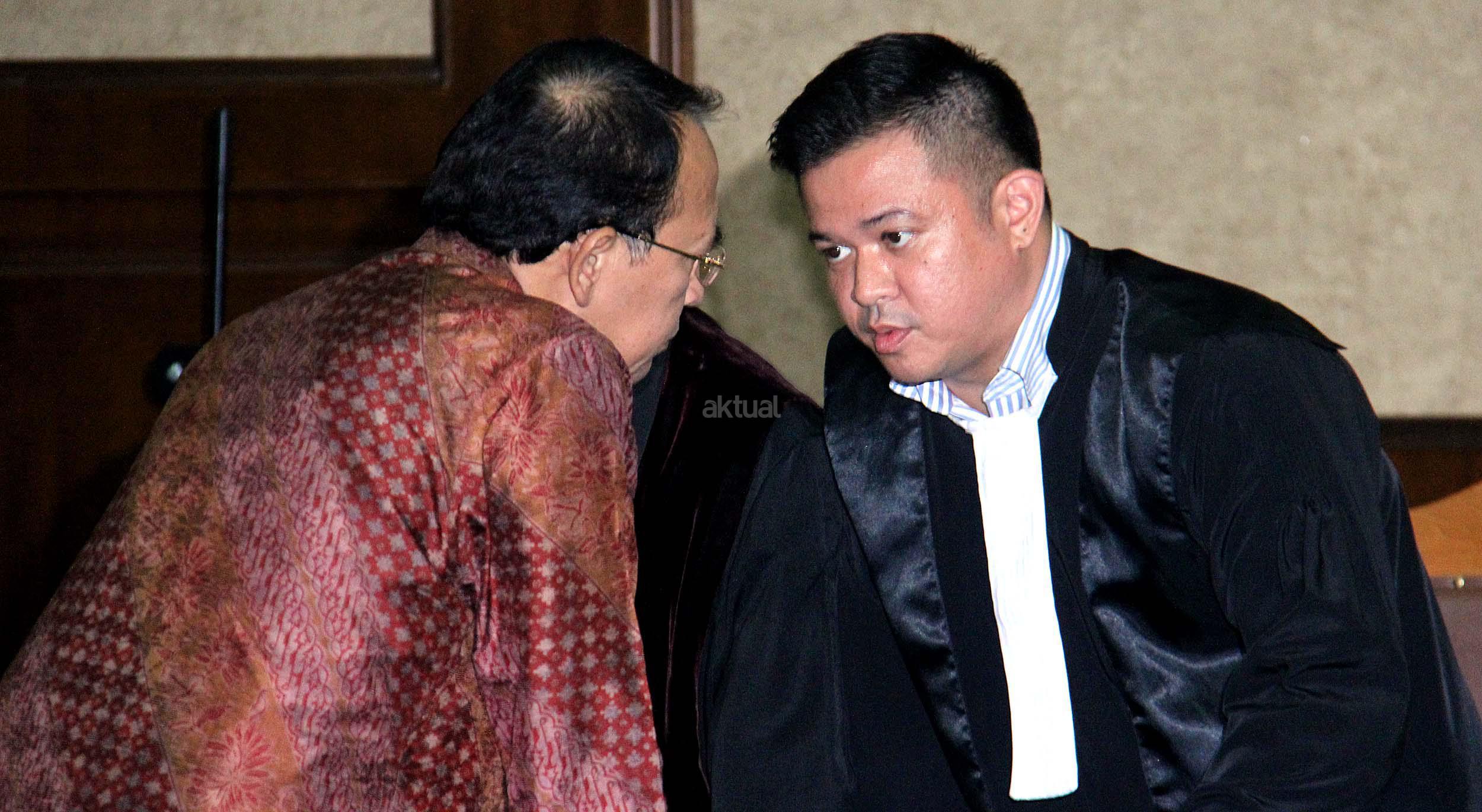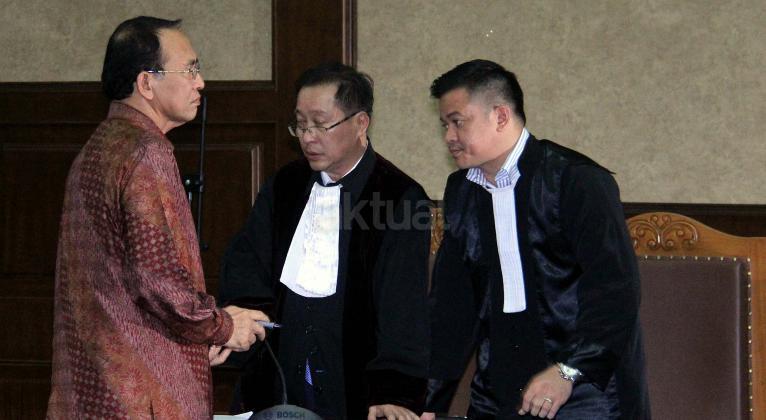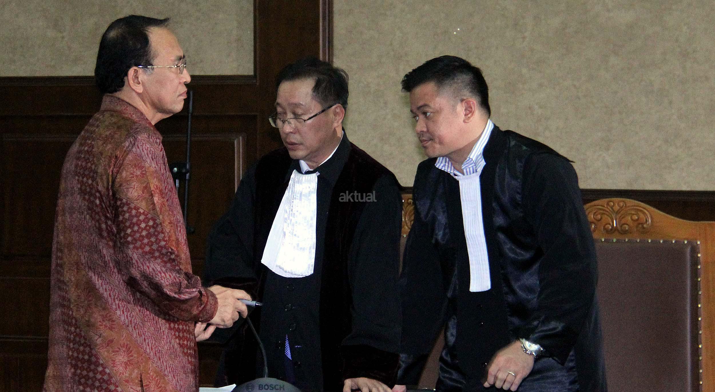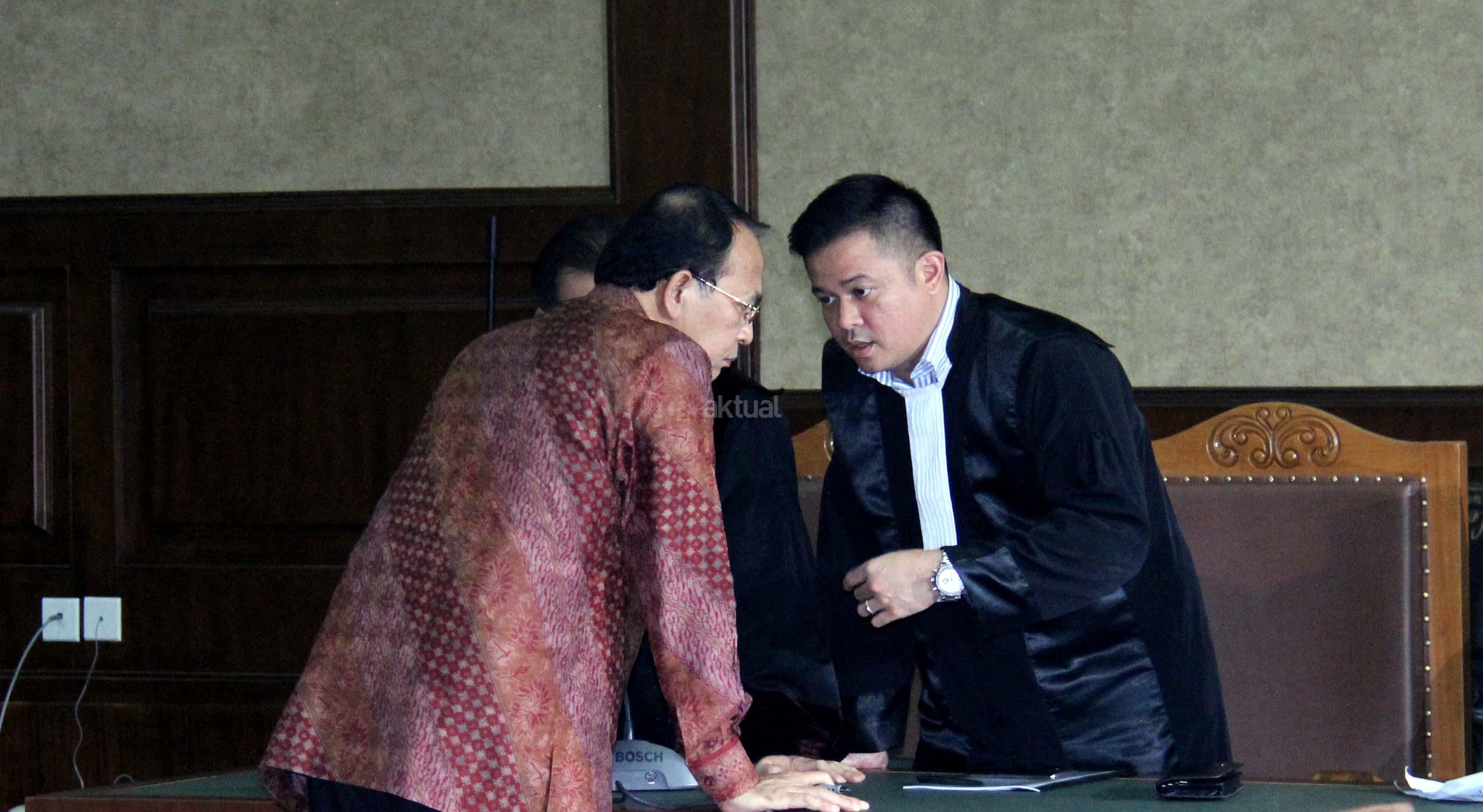 Mantan Menteri Agama Suryadharma Ali saat berkonsultasi dengan team pengacaranya usai dibacakan vonis oleh Majelis Hakim di Pengadilan Tipikor, Jakarta, Senin (11/1/2016). Dalam putusan Majelis Hakim Pengadilan Tipikor memvonis Suryadharma Ali enam tahun penjara denda tiga ratus juta rupiah subsider tiga bulan dan pindana tambahan uang pengganti 1,821 miliar subsider dua tahun penjara.
